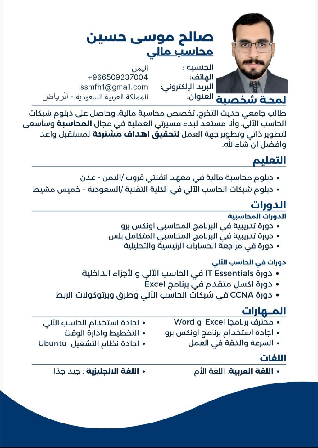 محاسب يمني متواجد في الرياض حاصل على شهادات في برامج محاسبية مثل أونكس برو والمتكامل بلس، حاصل على دبلوم شبكات الحاسب الآلي ولدي عدة دورات في الحاسب الآلي، خبرة في الأعمال المحاسبية منها تحديد ورفع الضريبة لهيئة الزكاة والضريبة، القوائم المالية، اجادة القيود اليومية ومطابقة البنوك، واستحقاقات وصرف رواتب الموظفين، احتساب الإيجارات، تقارير الأستاذ العام، مطابقة كشوف حسابات العملاء، وحسابات الموردين