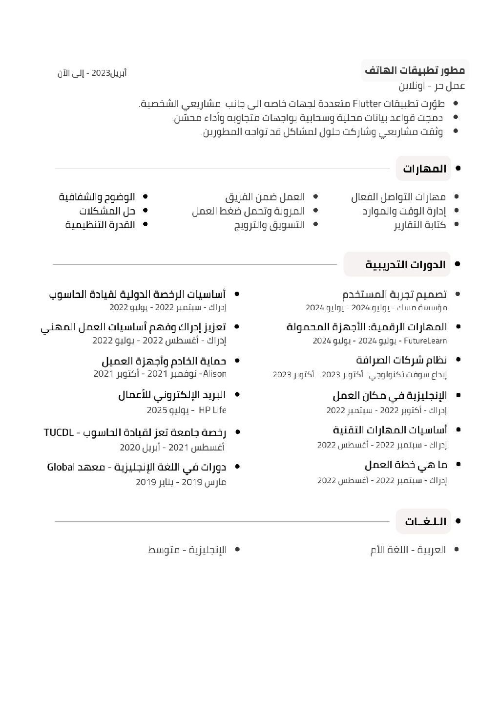 اعلان بحث عن وظيفة في أحد المجالات التالية مطور تطبيقات اندرويد خبرة متوسطة في تطوير تطبيقات عالية الأداء باستخدام Flutter وقواعد البيانات أخصائي دعم فني IT خبرة في حل المشاكل التقنية وإدارة أنظمة ERP موظف مبيعات مهارات في الاقناع وخدمة العملاء مؤهل دبلوم عالي في تقنية المعلومات امتياز في المركز الأول اللغة (العربية - لغة ألام والانجليزية - متقدم) تواصل معي لطلب السيرة الذاتية