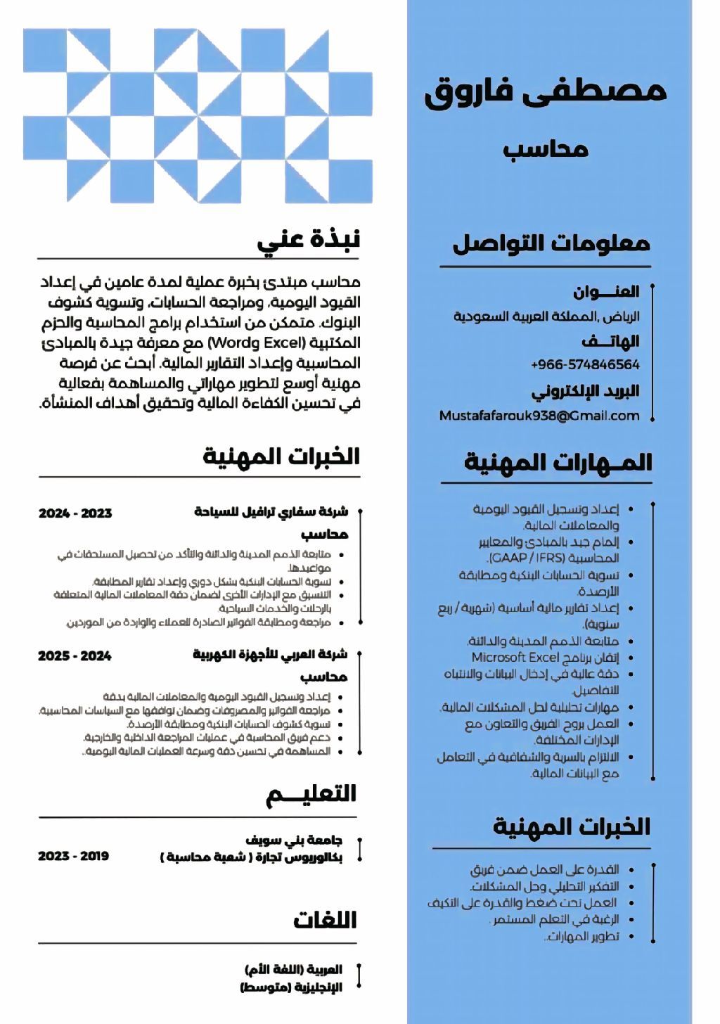 محاسب بخبرة عملية عامين في اعداد القيود اليومية ومراجعة الحسابات وتسوية كشوف البنوك متمكن من استخدام برامج المحاسبة وبرامج المايكروسوفت خاصة excel حاصل على دبلومة Mos Master مع معرفة جيدة بالمبادئ المحاسبية. ابحث عن فرصة مهنية أوسع لتطوير مهاراتي والمساهمة بفعالية في تحسين الكفاءة المالية وتحقيق أهداف المنشأة وموجود في الرياض امتلك إقامة سارية ومتاح نقل كفالة
