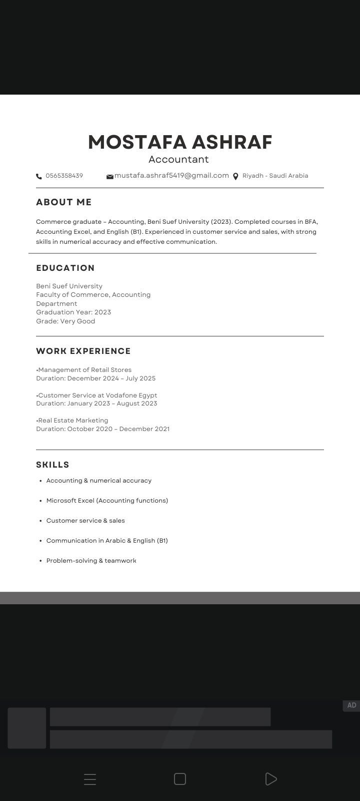 محاسب خريج كلية التجارة قسم المحاسبة بتقدير عام جيد جدا، حاصل علي دورات تدريبية منها دورة BFA، ودورة Excel للمحاسبة، ودورة لغة انجليزية بمستوى B1 خبرة عملية في الحسابات بشركة اتصالات بالاضافة الى خبرة في مجال المبيعات والتسويق العقاري وإدارة المخازن والمتاجر للمواد الغذائية، اجادة عمل القيود اليومية واعداد التقارير المالية والتسويات البنكية والدقة في التعامل مع الأرقام، والعمل ضمن فريق أو عمل فردي