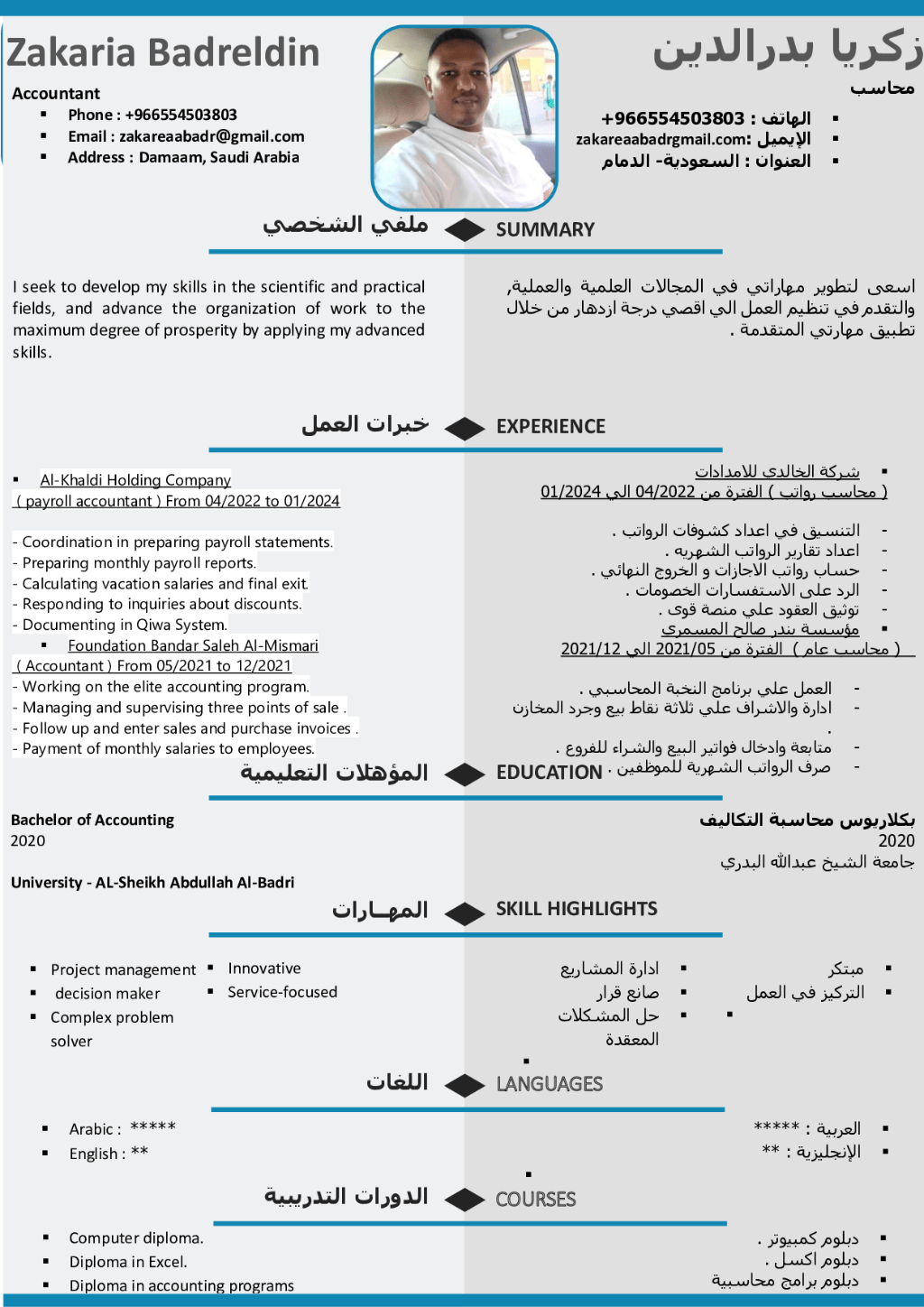 محاسب - رواتب بشركة الخالدي في الدمام خبرة خمسة سنوات أكثر من 1500 موظف تحويل الرواتب اجازات خروج نهائي بدل اجازات سلف مخالفات غرامات - انشاء عقود علي منصة قوى متابعة الملفات والتوقفات - والقضايا مراجعة التايم شيت والاضافي - خبرة في الاكسل خبرة في منصة قوى خبرة في البرامج المحاسبية خبرة في برامج الموارد البشرية