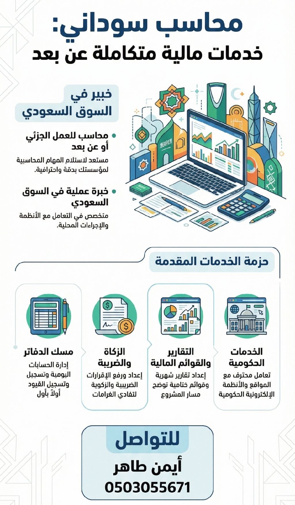 محاسب سوداني الجنسية دوام جزئي / عن بعد) لدي خبرة في المجالات التالية مسك الدفاتر المحاسبية وإدارة الحسابات اليومية - التعامل مع المواقع الحكومية والأنظمة الالكترونية - اعداد القوائم المالية بدقة واحترافية - خبرة في اعداد الاقرارات الضريبية والزكوية