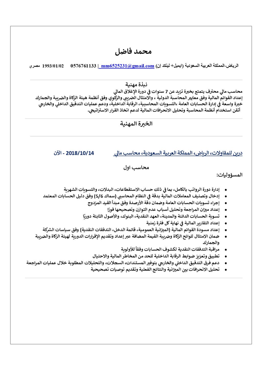 محاسب مالي محترف يتمتع بخبرة تزيد عن 7 سنوات في دورة الاغلاق المالي اعداد القوائم المالية وفق معايير المحاسبة الدولية، والامتثال الضريبي والزكوي وفق أنظمة هيئة الزكاة والضريبة والجمارك خبرة واسعة في إدارة الحسابات العامة، التسويات المحاسبية، الرقابة الداخلية، ودعم عمليات التدقيق الداخلي والخارجي. أتقن استخدام أنظمة المحاسبة وتحليل الانحرافات المالية لدعم اتخاذ القرار الاستراتيجي