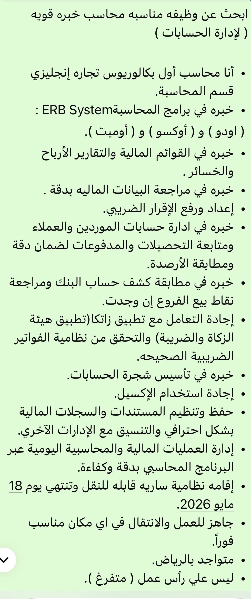 أنا محاسب أول بكالوريوس تجارة انجليزي قسم المحاسبة - خبرة في برامج المحاسبة ERB System أودو) أوكسو) أوميت) خبرة في القوائم المالية والتقارير - خبرة في مراجعة البيانات الماليه بدقة - اعداد ورفع الاقرار الضريبي - خبرة في ادارة حسابات الموردين والعملاء ومتابعة التحصيلات والمدفوعات لضمان دقة ومطابقة الأرصدة - خبرة في مطابقة كشف حساب البنك وخبرة في تأسيس شجرة الحسابات وإقامة سارية نظامية قابلة للنقل
