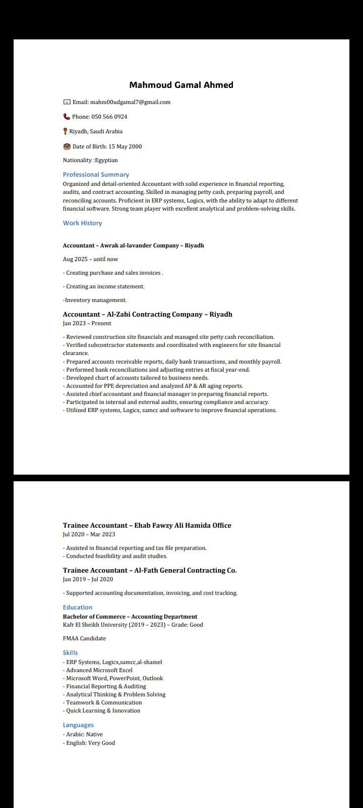 محاسب ابحث عن فرصة عمل داخل المملكة اعمل حاليا في مؤسسة، ولدي خبرة في القيود المحاسبية والتقارير المالية ومتابعة العملاء والموردين. أجيد التعامل مع البرامج المحاسبية وأسعى لفرصة جديدة لتطوير خبرتي والمساهمة في نجاح الشركة