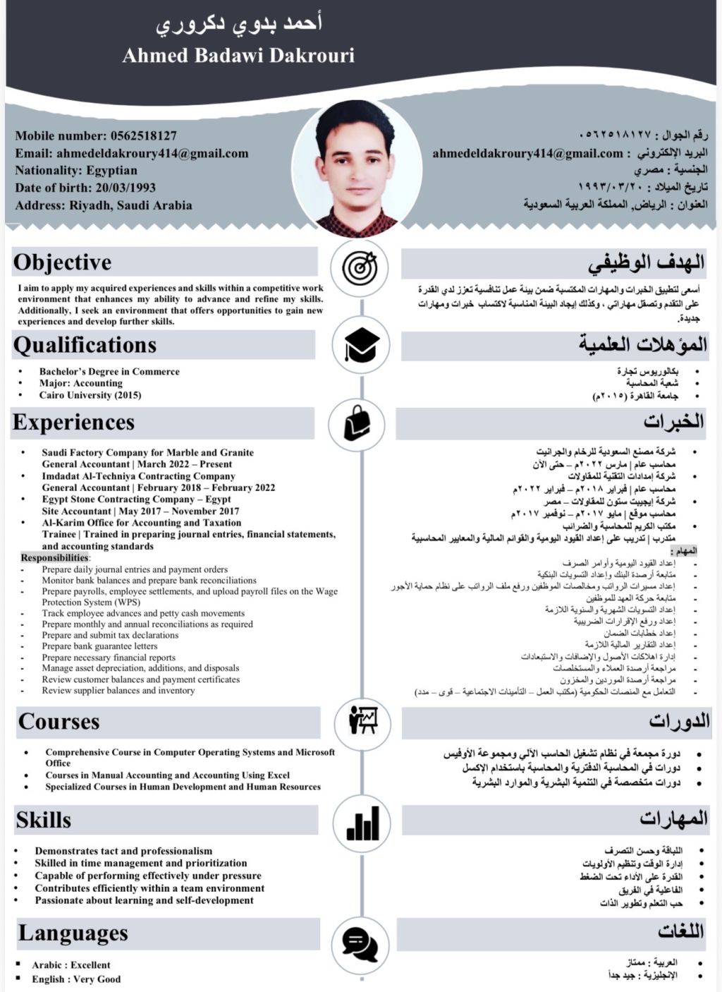 محاسب عام مصري خبرة 7 سنوات في مجال المقاولات، إقامة سارية والمهنة محاسب
