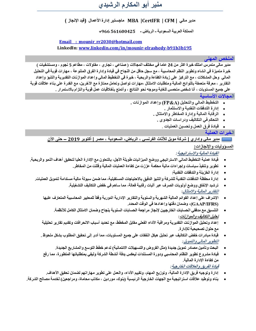 مدير مالي متمرس ابحث عن فرصة مناسبة، امتلك بخبرة تمتد لأكثر من 24 عاما في الإدارة المالية والنظم المحاسبية ERP، ودراسات الجدوى، حاصل على شهادات دولية في مجال المحاسبة CertIFR CFM، بالاضافة الى ماجستير إدارة أعمال MBA (قيد الانجاز) ولي خبرات طويلة مع منشاءات متنوعة في قطاعات التجارة، الصناعة، المقاولات والخدمات، مع سجل حافل من النجاح في قيادة وإدارة الفرق المتنوعة، مهارات قوية في التحليل المالي