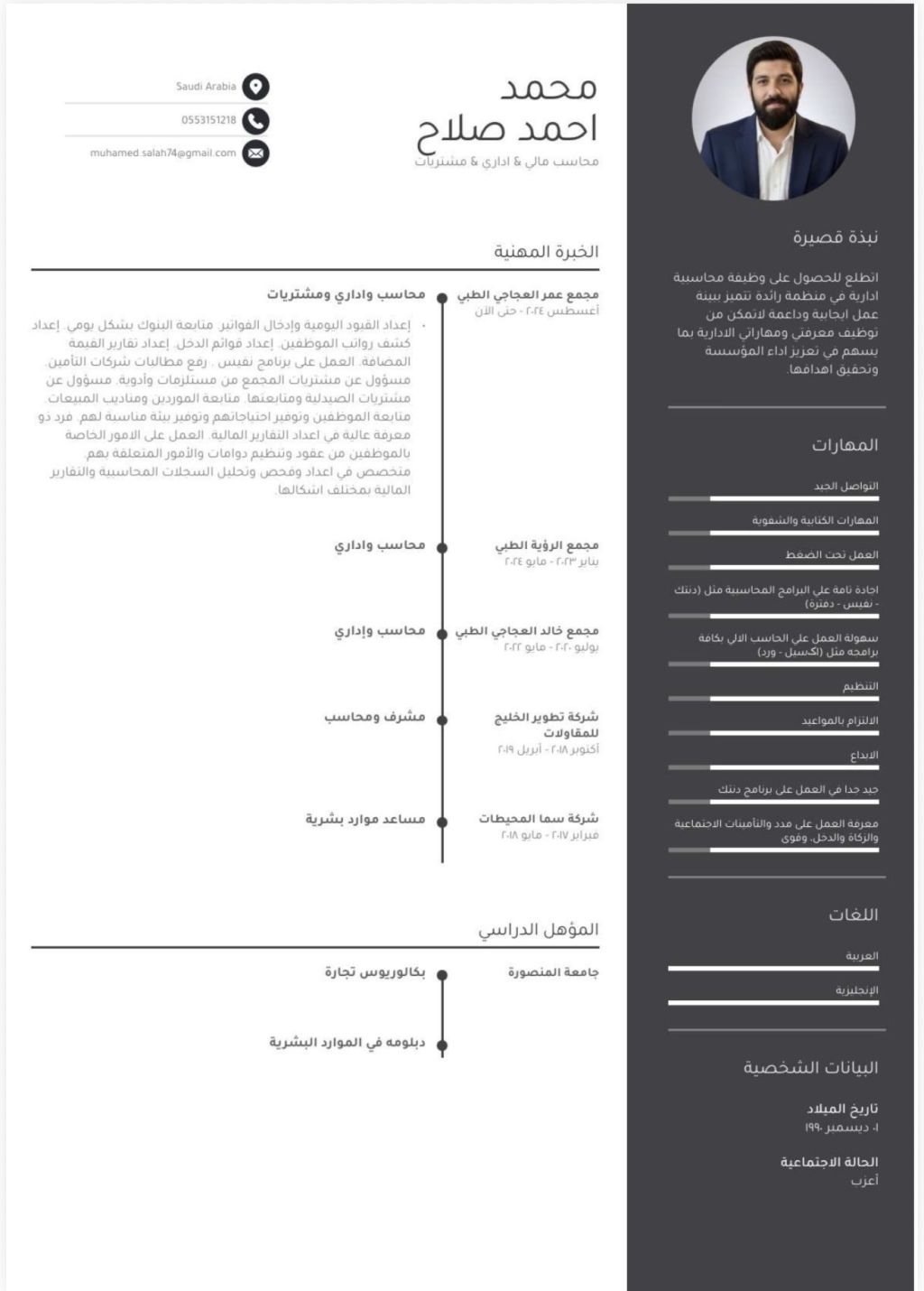 أنا محاسب خبرة أكثر من 5 سنوات في الحسابات والتأمين الطبي والمشتريات والامور الاداريه الخاصه بالمجال الطبي