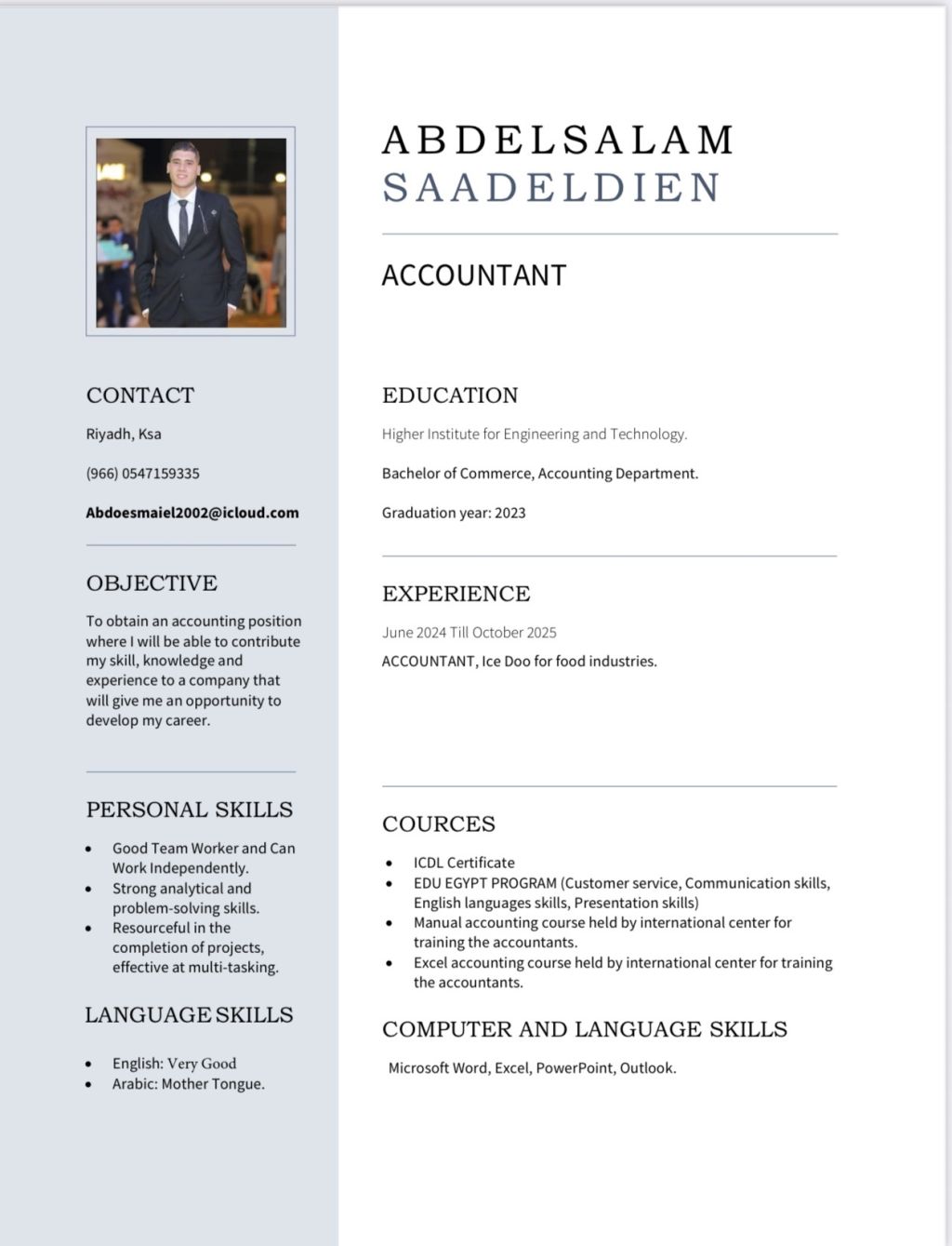 محاسب مصري حديث التخرج يبحث عن عمل داخل مدينة الرياض إقامة سارية متاح نقل كفالة