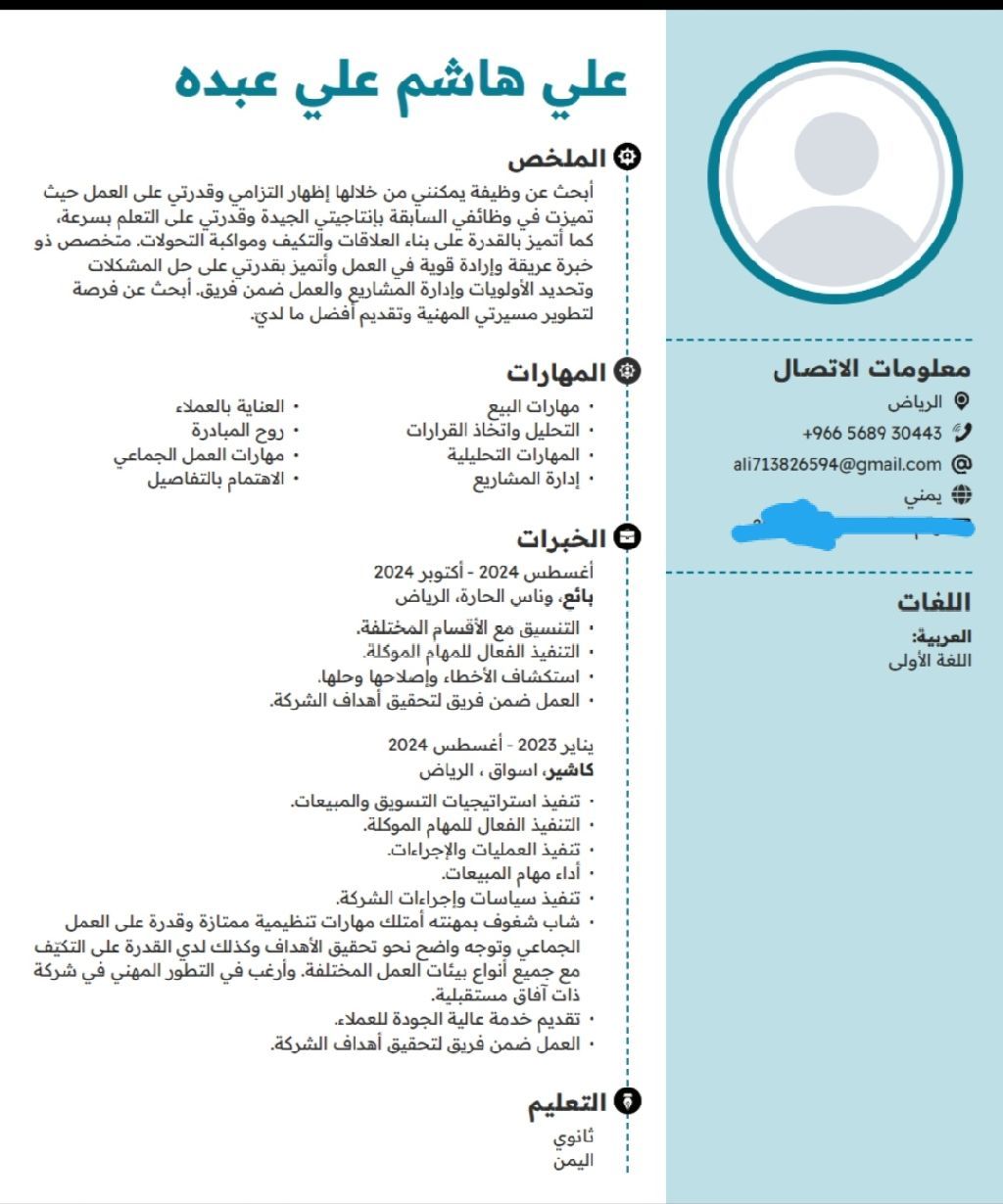 ابحث عن وظيفة يمكنني من خلالها اظهار التزامي وقدرتي على العمل حيث تميزت في وظائفي السابقة بإنتاجيتي الجيدة وقدرتي على التعلم بسرعة كما أتميز بالقدرة على بناء العلاقات والتكيف ومواكبة التحولات متخصص ذو خبرة عريقة وإرادة قوية في العمل وأتميز بقدرتي على حل المشكلات وتحديد الأولويات وإدارة المشاريع والعمل ضمن فريق ابحث عن فرصة لتطوير مسيرتي المهنية وتقديم أفضل ما لدي