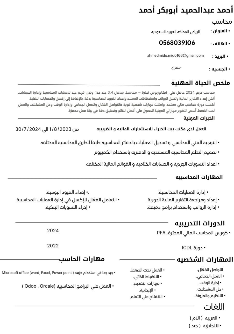 محاسب حاصل علي بكالوريوس تجارة بتقدير عام جيد جدا 2024 سبق لي العمل أثناء الدراسة في مكتب بيت الخبراء للاستثمارات الماليه والضريبيه والذي اكتسبت منه بعض الخبرات، حاصل علي دورة PFA (اكسل، أودو، أوريكال) أجيد القراءة والكتابة باللغة الانجليزية بطريقه جيده ومقبول في الترجمة ابحث عن وظيفة