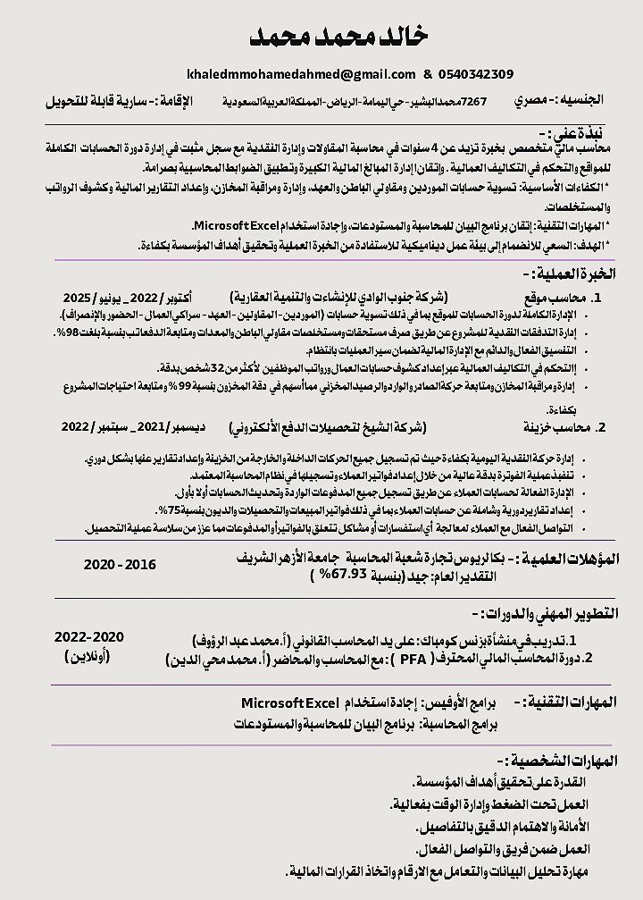 محاسب مصري خريج 2020 جامعة الأزهر الشريف عملت كمحاسب موقع في شركة مقاولات لمدة ثلاث سنوات وعملت كمحاسب خزينة لمدة سنة ابحث عن عمل محاسب موقع أو محاسب حديث تخرج متواجد في الرياض وجاهز لبدء العمل فورا إقامة سارية ولا أجيد القيادة