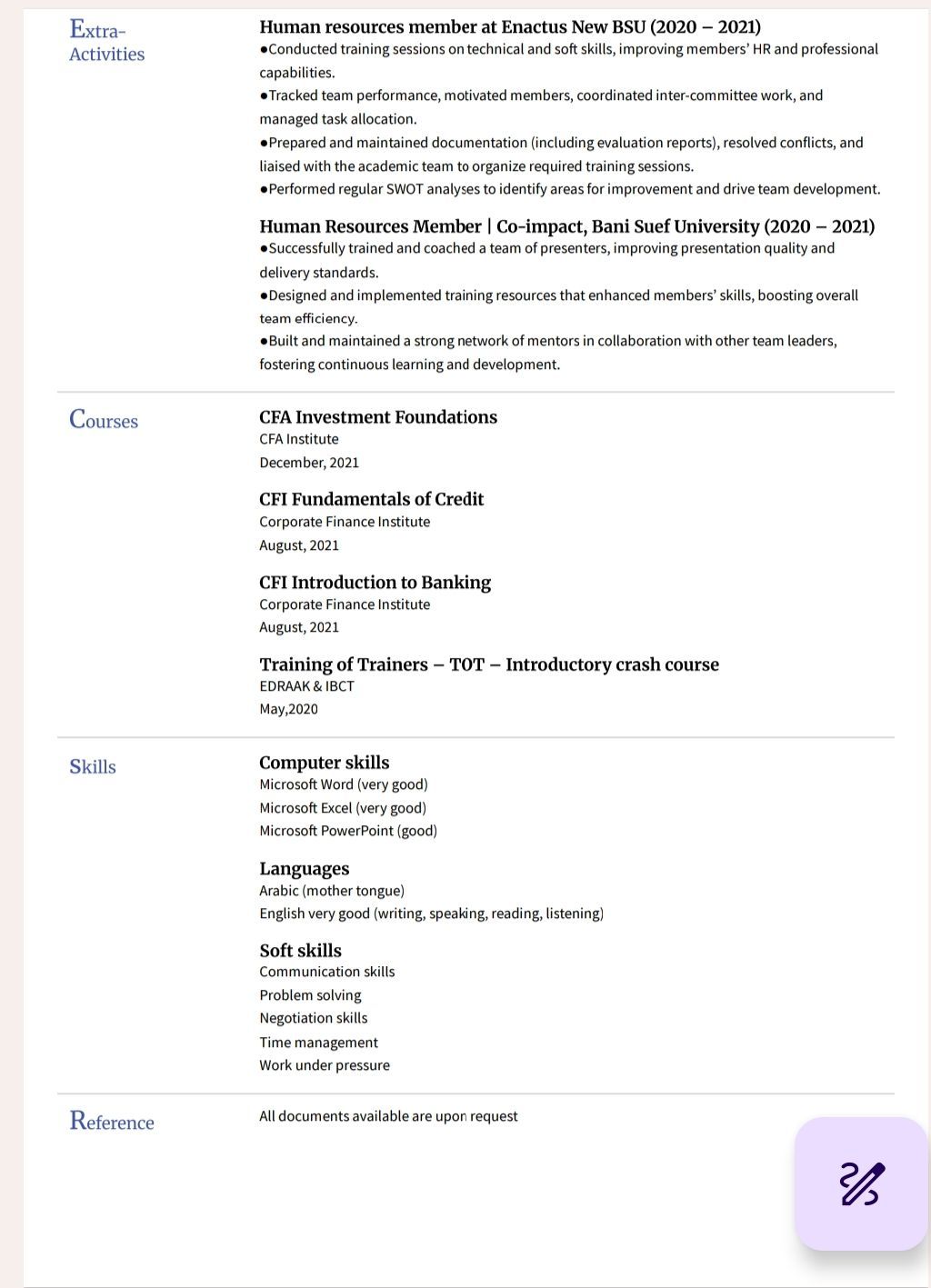 أنا مقيم في الرياض حاصل على بكالوريوس محاسبه انجليزية بتقدير عام جيد جدا واشتغلت محاسب واشتغلت مستشار مبيعات وخدمة عملاء في شركات كبيرة مثل شركة فودافون وشركة اتصالات للخدمات الدولية في مصر ومعي العديد من الكورسات الماليه والاداريه وتدربت في بنوك مصرية مثل بنك مصر وأيضا كنت عضو الموارد البشرية في مؤسسة ايناكتس نيو بنى سويف وابحث عن فرصة عمل كمحاسب أو شغل اداري