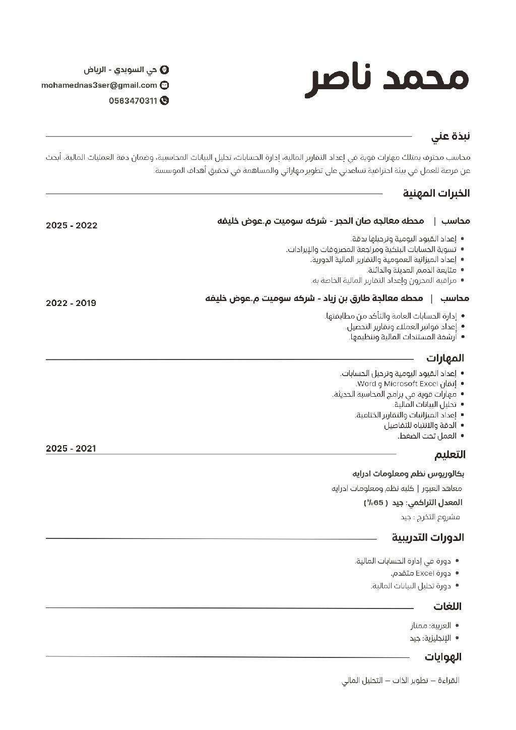 محاسب ذو خبرة تتجاوز 3 سنوات في اعداد التقارير المالية، إدارة الحسابات، تحليل البيانات المحاسبية، ومراجعة العمليات اليومية بدقة عالية. عملت في محطات معالجة المياه، حيث قمت بإدارة الحسابات، متابعة المقبوضات والايرادات، اعداد القوائم المالية، وإجراء التسويات البنكية والمالية الدورية. امتلك مهارات قوية في برامج المحاسبة الحديثة وExcel، اضافة الى القدرة على تطوير الأنظمة المالية وتحليل البيانات