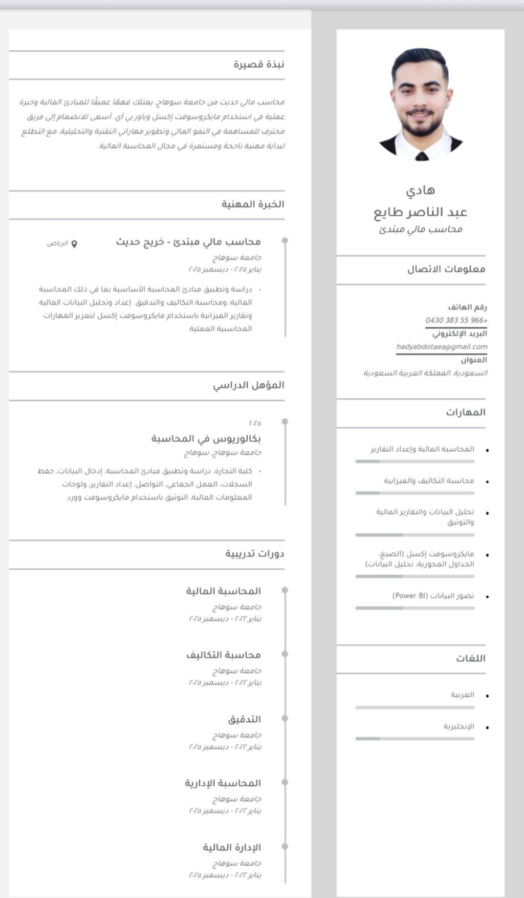 محاسب حديث تخرج - جاهز للعمل فورا شاب ملتزم، فاهم أساسيات المحاسبة كويس واشتغلت عملي على Excel والقيود اليومية. حابب ابدأ شغل وأتعلم وأطور من نفسي الرياض - جاهز فورا للتواصل