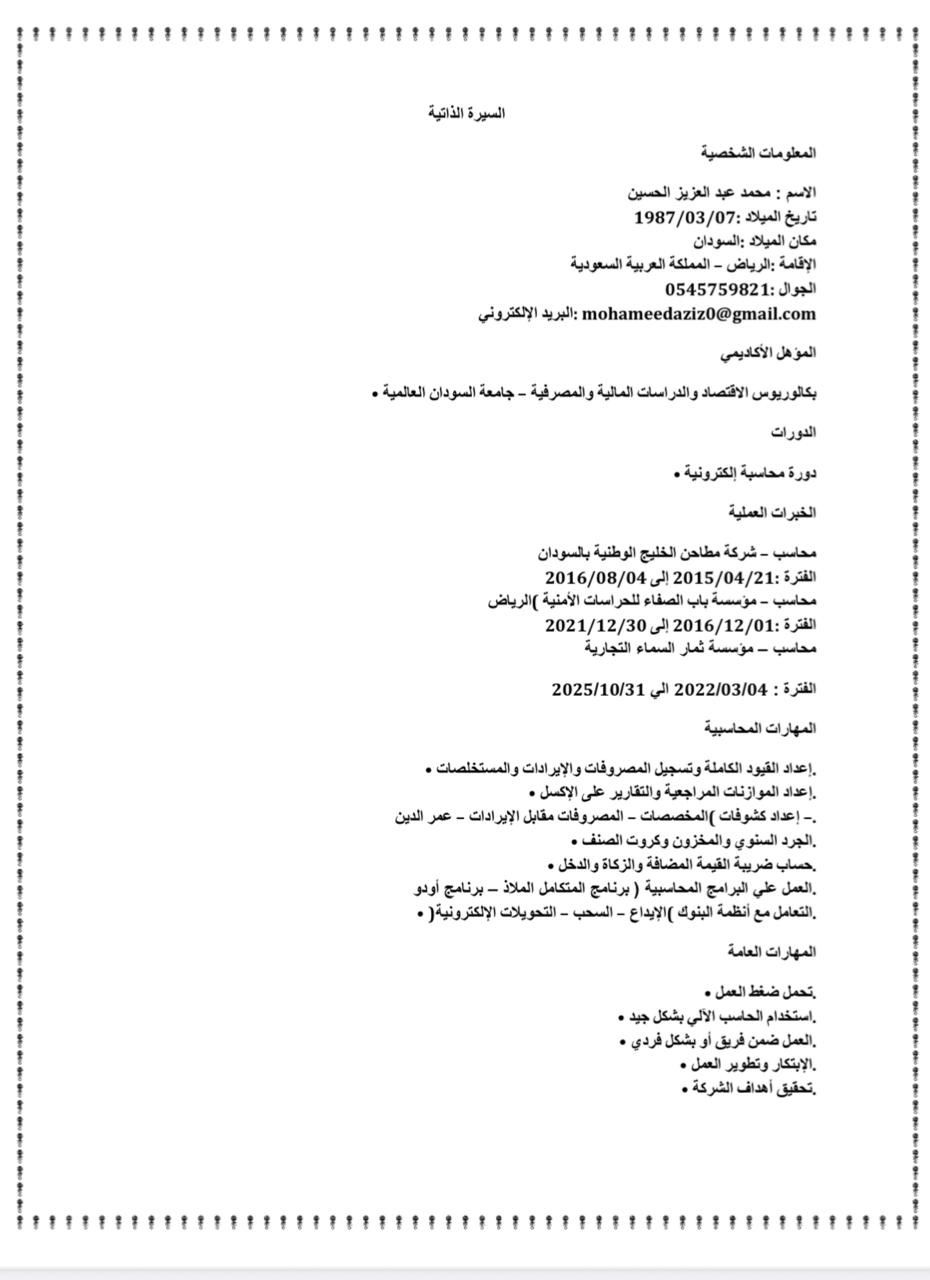 محاسب سوداني الجنسية - محمد عبد العزيز - خبرة 9 سنوات في السعودية خبرة في برامج البرامج المحاسبية الملاذ المتكامل والمحيط وأودو والأكسيل من اعداد القيود اليومية، ومتابعة حسابات العملاء والموردين، ومطابقة حسابات البنوك وتسوية العهد، ومراقبة المخزون واعداد الاقرار الضريبي. جاهز للعمل ومتاح نقل كفالة. ومرفق السيرة الذاتية