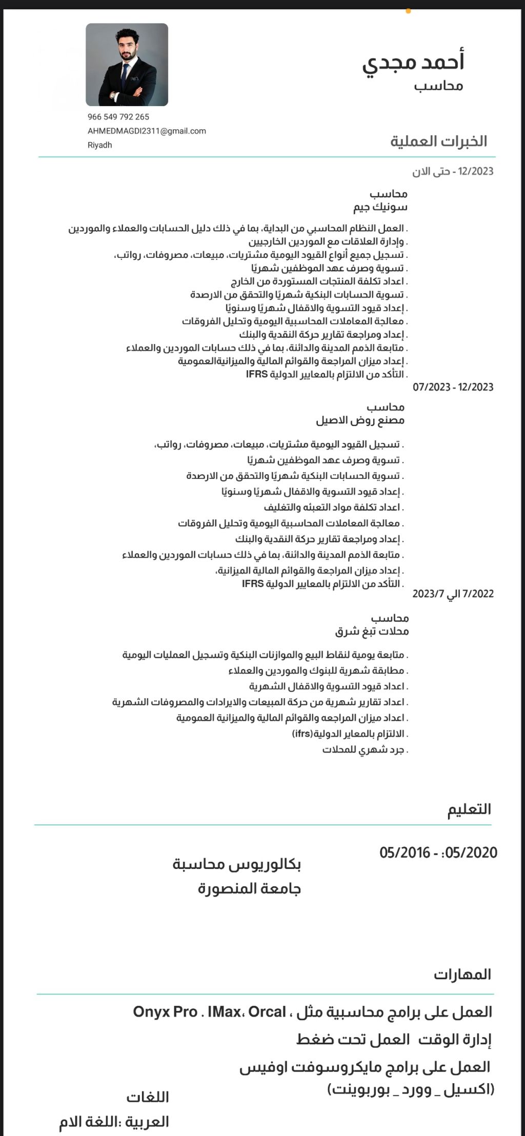 محاسب مالي خبرة في اعداد التقارير المالية وادارة الحسابات العامة وحسابات العملاء والموردين وتسوية الأرصدة والمطابقات البنكية وتسجيل كافة المعاملات اليومية واصدار القوائم المالية