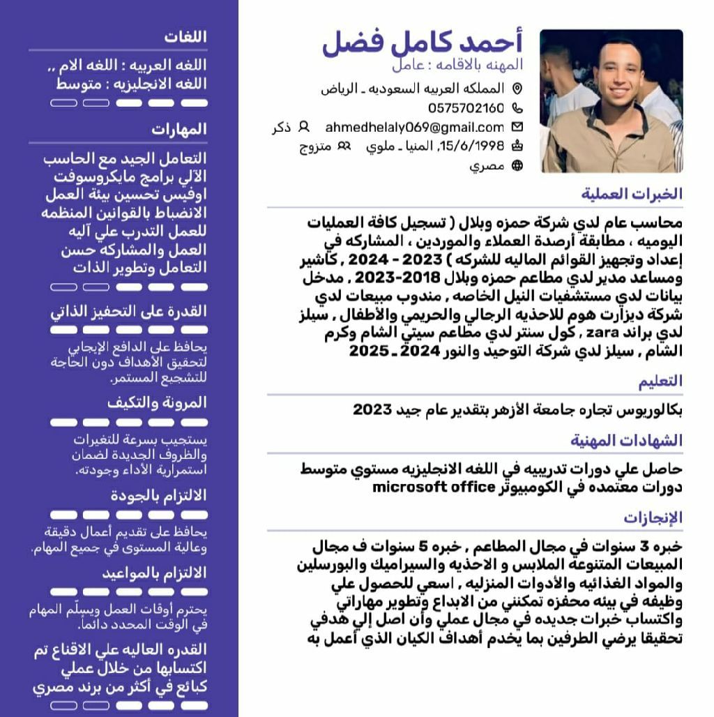 محاسب عام، سيلز، مدير مطعم، مدخل بيانات خبرة 3 سنوات في مجال المطاعم، خبرة 5 سنوات في مجال المبيعات المتنوعه الملابس والأحذية والسيراميك والبورسلان والمواد الغذائية والأدوات المنزليه