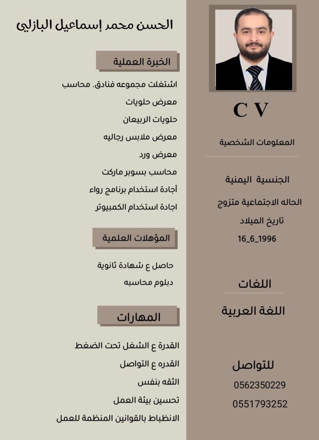 اشتغلت في محل. حلويات. محاسب وفي محل ورد محاسب واشتغل في محل ملابس رجاليه. في الخرج