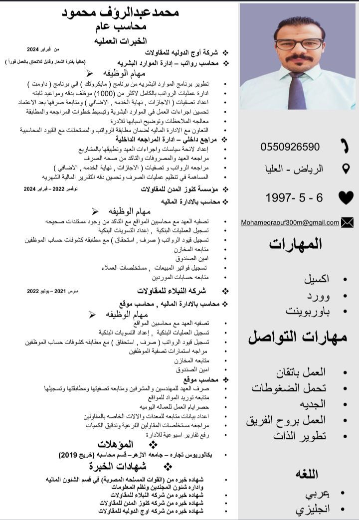 ابحث عن فرصة عمل. الاسم محمد عبد الرؤف خبرة بشركات المقاولات المهنة محاسب رواتب، محاسب HR، محاسب تصفيات عهد، محاسب موقع، خبرة بالمراجعة الداخليه، محاسب بنوك، محاسب موردين
