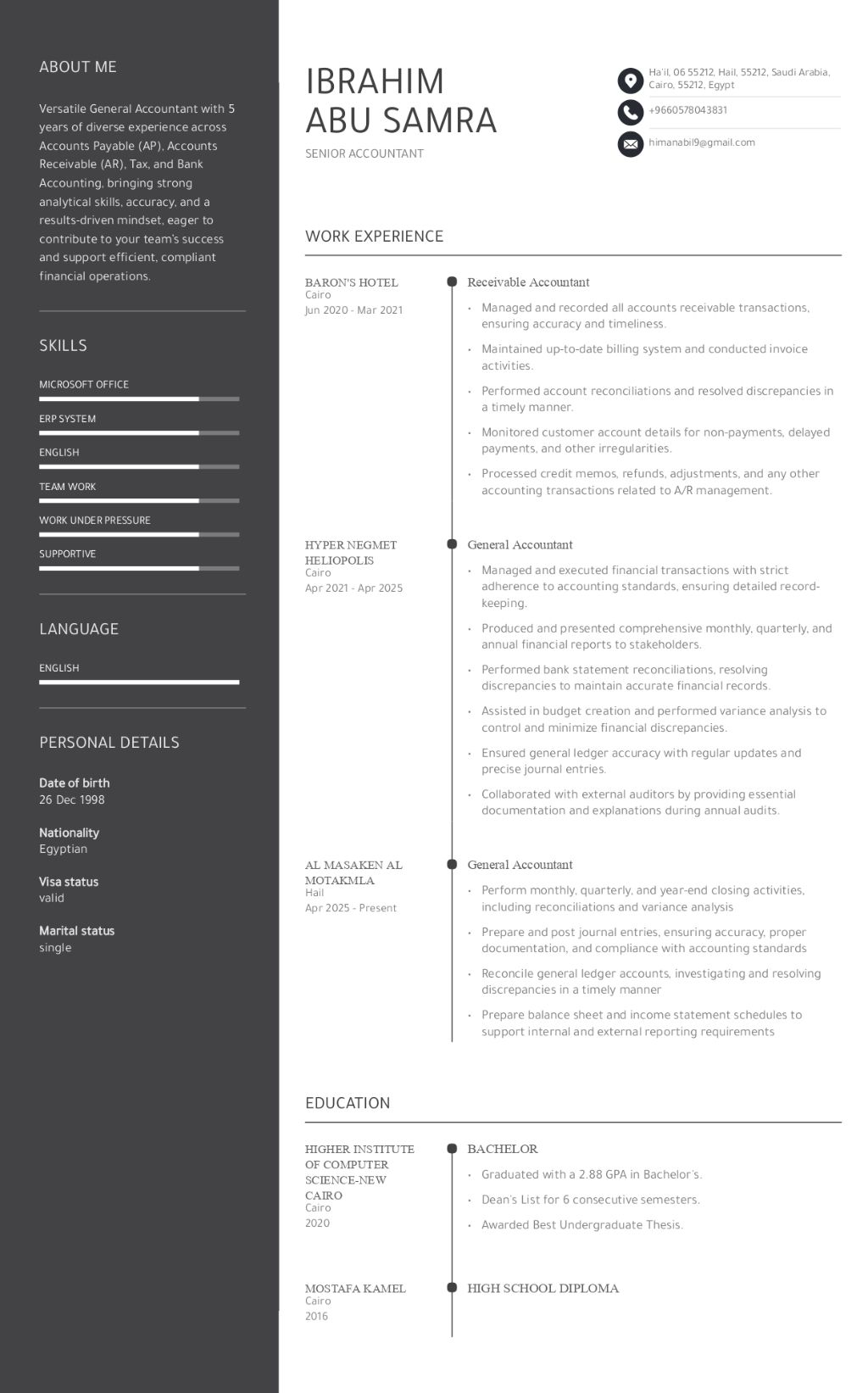 محاسب عام متعدد المهارات مع 5 سنوات من الخبرة المتنوعة في الحسابات الدائنة (AP (الحسابات المدينة (AR (الضرائب، والمحاسبة البنكية، اعداد القيود والقوائم الماليه والحسابات الجردية والإقفالات، يتمتع بمهارات تحليلية قوية، دقة، وعقلية موجهة نحو النتائج، متحمس للمساهمة في نجاح فريقكم ودعم العمليات المالية الفعالة والمتوافقة عملت في المملكة لمدة 7 أشهر في الأعمال التالية تكوين شجرة حسابات - عمل دورة