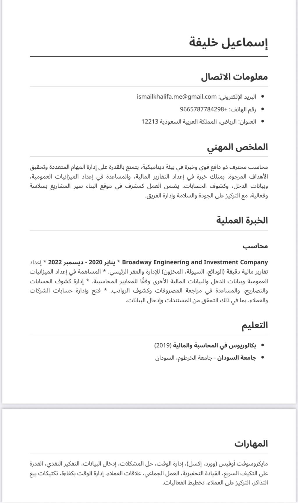 محاسب مالي ذو خبرة عالية في مجال الحسابات سبق أن عملت في عدة شركات ابحث عن الانضمام الى فريق عمل جديد للمساهمة في الادارة المالية للمشاريع بكفاءة ودقة خبرة في ادخال القيود اليومية واعداد التقارير المالية الدورية وادارة الحسابات العامة أجيد التعامل مع برامج مايكروسوفت