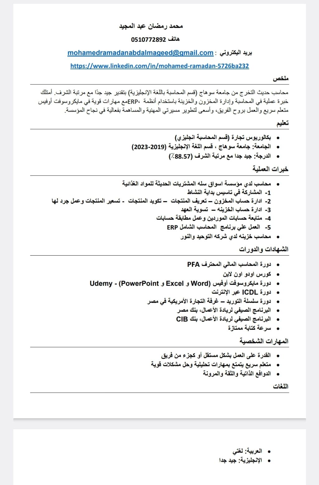 محاسب خبرة سنتين حاصل علي بكالوريوس تجارة قسم محاسبه انجليزي متواجد في الرياض بتأشيرة عمل حرة عملت سابقا محاسبة خزينة ومحاسب في شركة مواد غذائية أجيد استخدام برامج الأوفيس وعملت علي نظام ERP منها نظام المحاسب الشامل وأودو ابحث عن فرصة عمل مناسبة