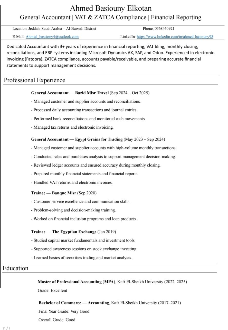محاسب مصري يبحث عن فرصة عمل مقيم في جدة خبرة 3 سنوات في المحاسبة المالية والادارية واعداد القوائم المالية، ومراجعة القيود اليومية، والعمل على أنظمة ERP (Microsoft Dynamics - SAP - Odoo) أتميز بالدقة، سرعة الانجاز، والعمل بروح الفريق، مع قدرة عالية على التحليل واعداد التقارير. جاهز للعمل فورا ونقل كفالة. للتواصل