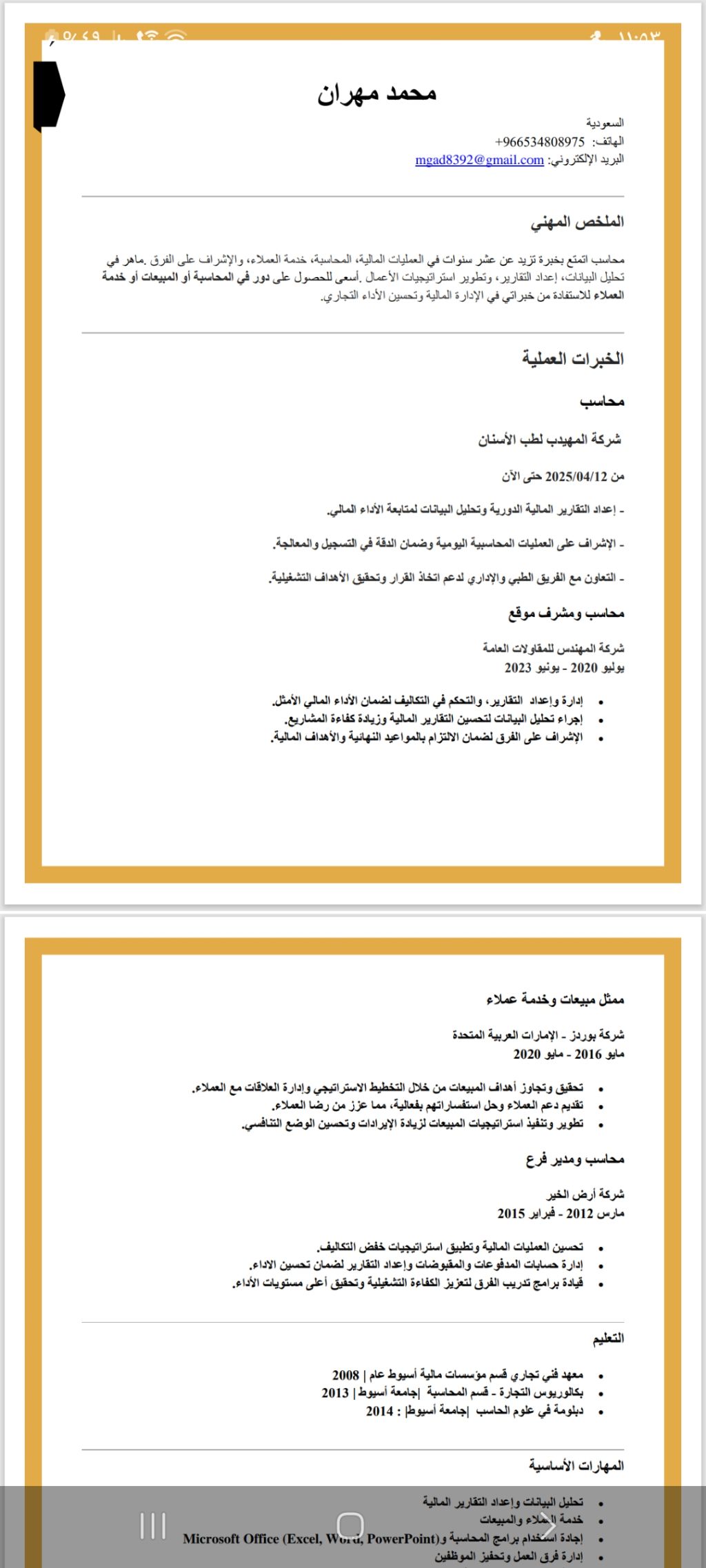 الاسم محمد مهران المسمى الوظيفي محاسب - خبرة أكثر من 10 سنوات في المحاسبة، المبيعات، وخدمة العملاء ابحث عن فرصة عمل في مجال المحاسبة أو الإدارة المالية أو المبيعات، حيث امتلك خبرة عملية في اعداد وتحليل التقارير المالية الدورية - إدارة الحسابات والعمليات البنكية اليومية - الاشراف على الفرق وتحفيز الموظفين لتحقيق الأهداف - خدمة العملاء وتحقيق رضاهم - تطوير استراتيجيات الأعمال وتحسين الأداء التجاري