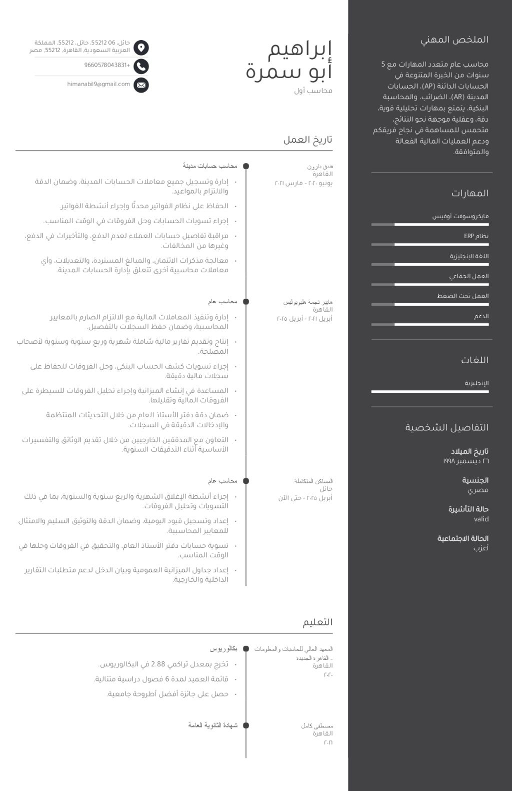 محاسب عام متعدد المهارات مع 5 سنوات من الخبرة المتنوعة في الحسابات الدائنة الموردين، الحسابات العملاء، الضرائب، والمحاسبة البنكية، اعداد القيود والقوائم الماليه والحسابات الجردية والإقفالات، يتمتع بمهارات تحليلية قوية، دقة، وعقلية موجهة نحو النتائج، متحمس للمساهمة في نجاح فريقكم ودعم العمليات المالية الفعالة والمتوافقة عملت في المملكة لمدة 7 أشهر في الأعمال التالية تكوين شجرة حسابات - عمل دورة