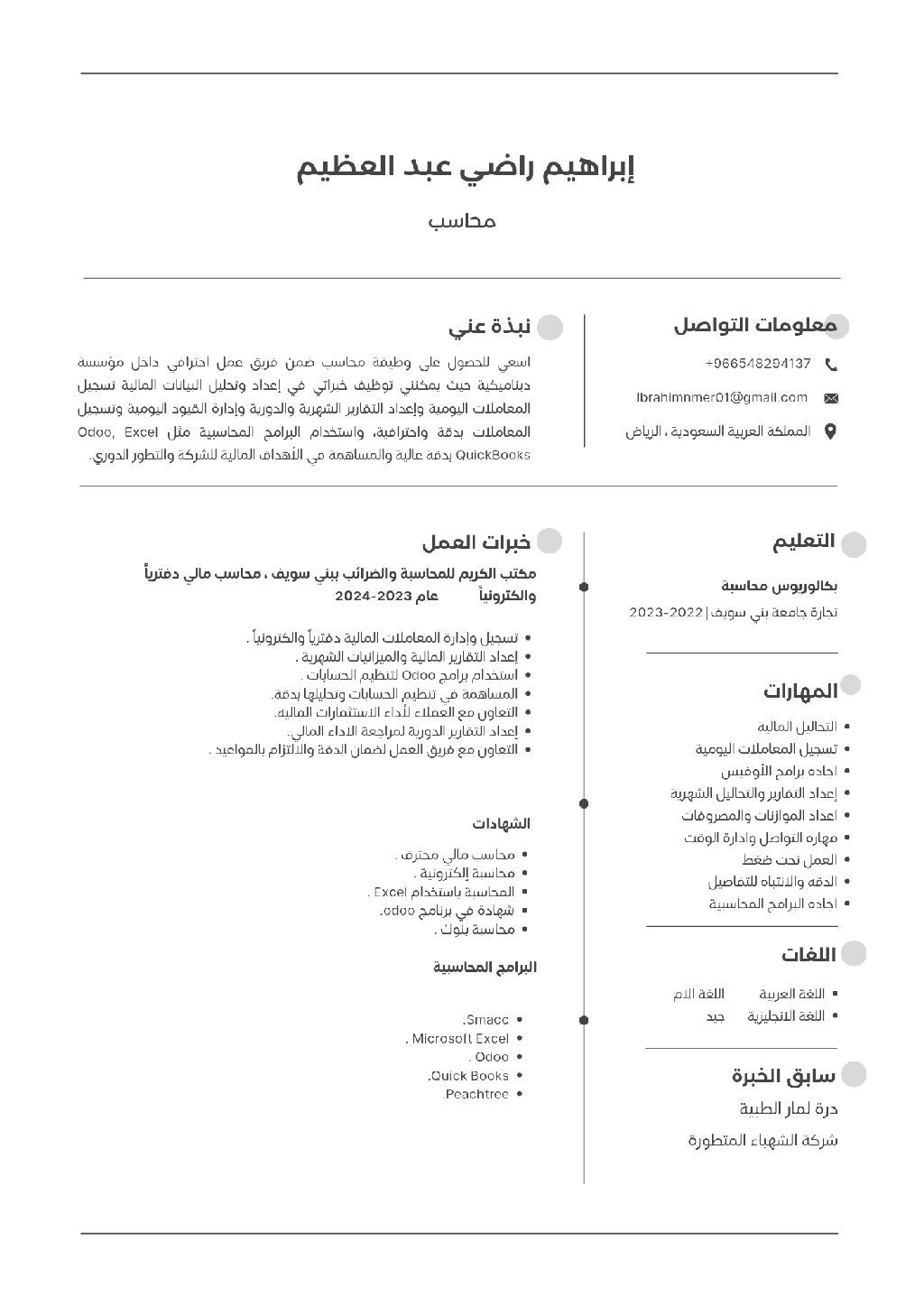 أتقدم للتقديم على وظيفة محاسب، لدي خبرة في القيود اليومية ومتابعة الحسابات واعداد التقارير، وأتميز بالدقة والالتزام وحسن تنظيم العمل، وأسعى للانضمام الى فريق عمل محترف والمساهمة في تحقيق أهداف الشركة
