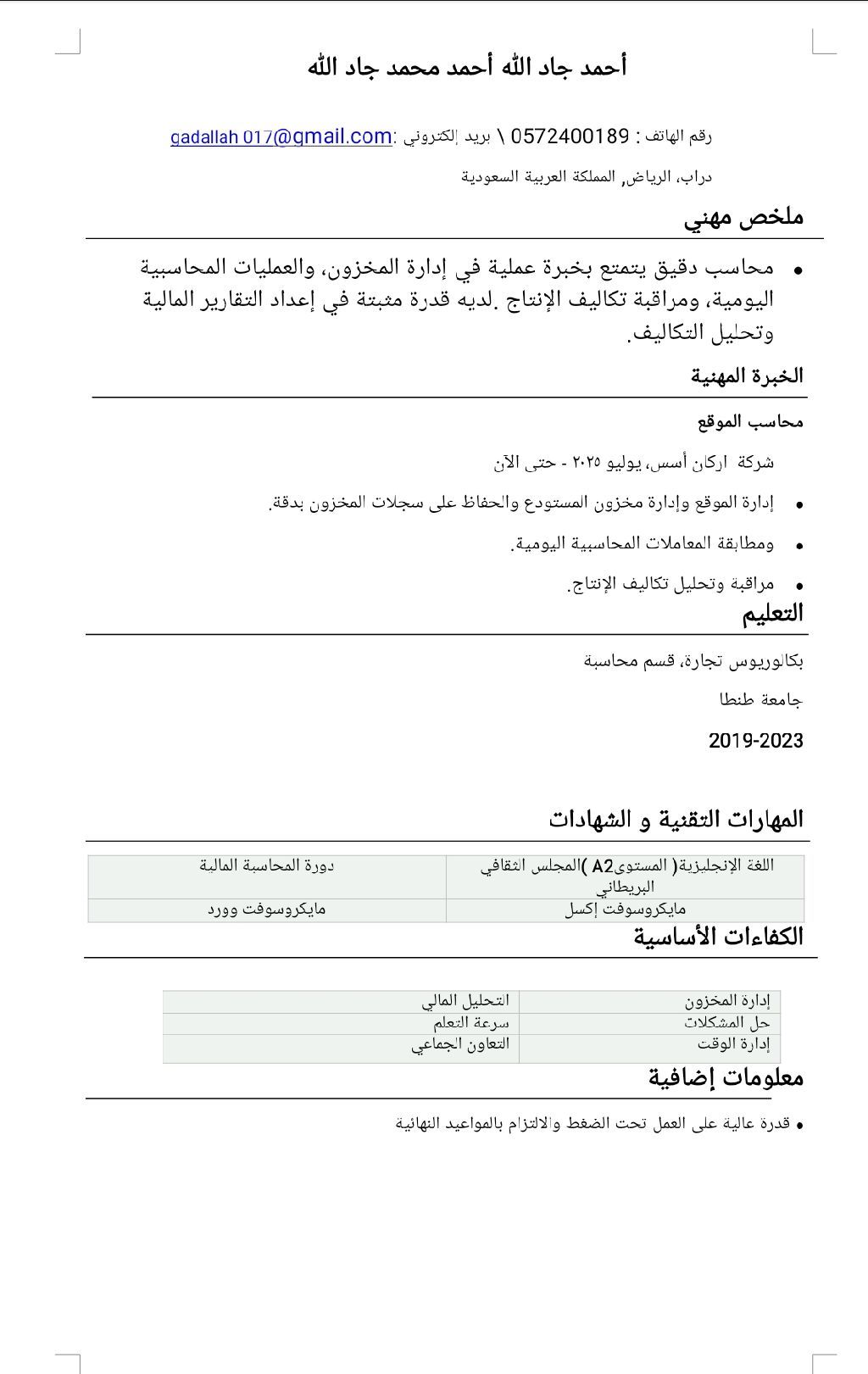 اسمي أحمد جاد الله خريج كلية التجارة تخصص محاسبة. خبرة في مجال المحاسبة والتقارير المالية، عندي خبرة عملية في استخدام برنامج Excel بشكل احترافي، سواء في اعداد الجداول والتقارير أو تحليل البيانات. كمان عندي معرفة كويسة بالمبادئ المحاسبية واعداد القيود اليومية ومتابعة الحسابات. المهارات الشخصية، أنا شخص سريع التعلم وبحب أطور نفسي باستمرار. عندي مرونة في التعامل مع المواقف الصعبة، العمل الجماعي