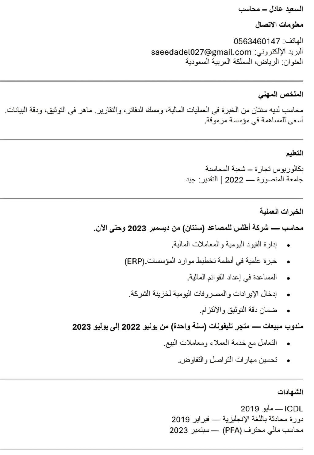 حاصل على بكالوريوس تجارة شعبة محاسبة ولدي خبرة عملية تزيد عن سنتين في مجال المحاسبة والعمليات المالية، عملت على إدارة القيود اليومية، مسك الدفاتر، ادخال الايرادات والمصروفات، والمساعدة في اعداد القوائم المالية، بالاضافة الى التعامل مع أنظمة ERP أتميز بالدقة في العمل، الالتزام، والقدرة على العمل تحت الضغط، وأسعى للانضمام الى مؤسسة محترمة أستطيع من خلالها تطوير مهاراتي والمساهمة في تحقيق أهدافها