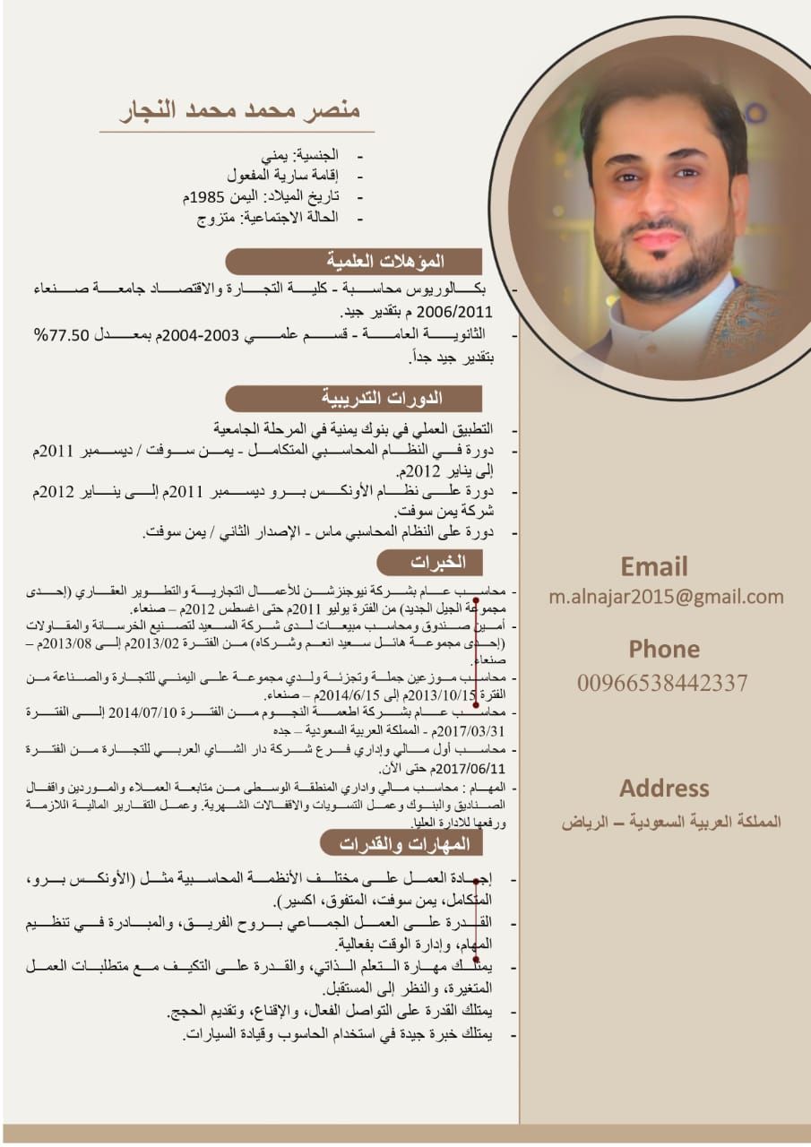 محاسب عام (أول) يمني الجنسية إقامة سارية للعمل الفوري ابحث على فرصة عمل بدوام كامل ببيئة عمل منتظمة وادارية بكالوريوس محاسبه تخرج 2010 - 2011 خبرة عمل في المجال 15 سنة منها 10 سنوات بالمملكة أكثر من دورة في الأنظمة المحاسبية وكذلك شهادة السوكبا. اجادة العمل على المايكروسوفت وايظا اعداد القوائم المالية ومراجعتها وتحليل المركز المالي للشركة متواجد حاليا في الرياض للتواصل