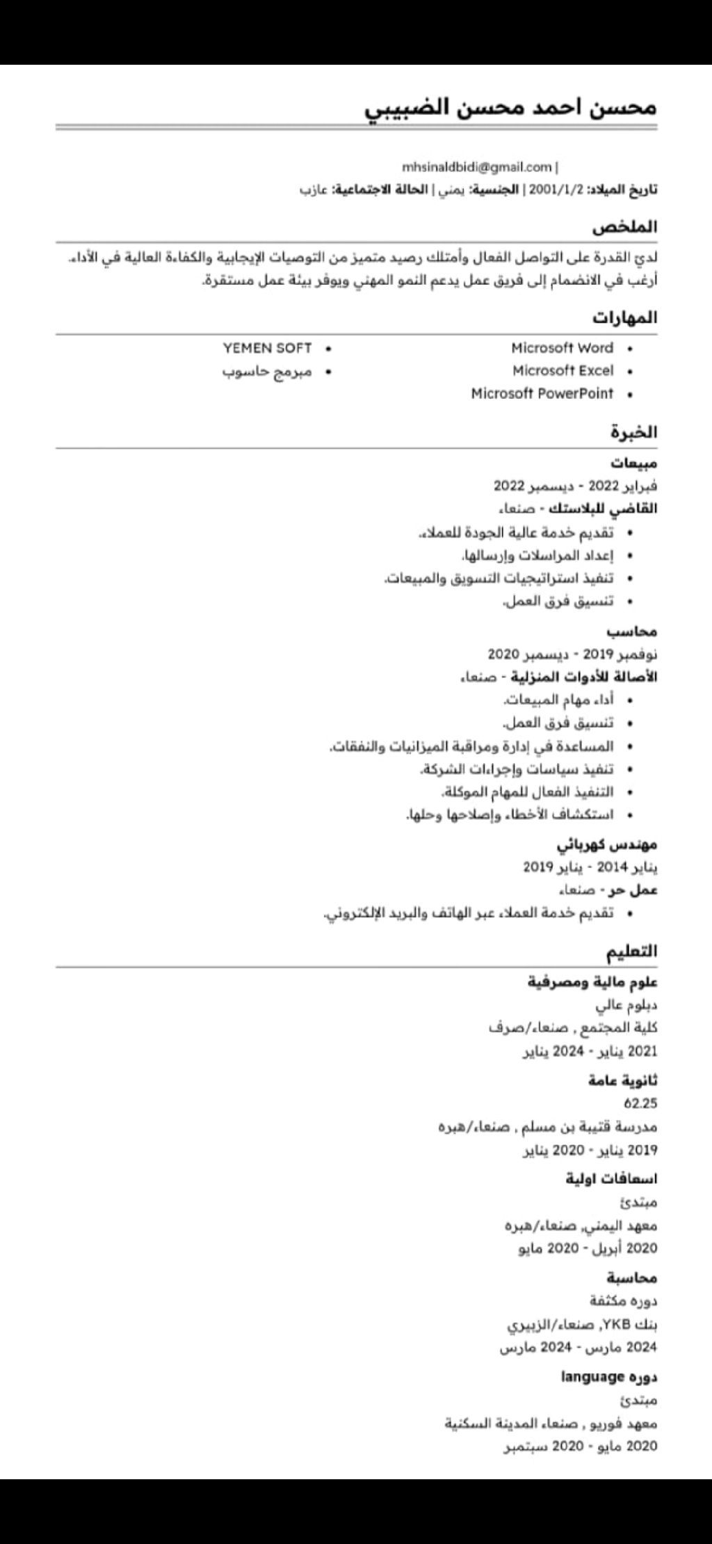 أنا يمني الجنسية محاسب وسكرتير موجود في السعودية خريج محاسبة، خبرة سنة، أجيد، جميع البرامج المحاسبية، برنامج أودو ودفتره القيود اليومية، دفتر الأستاذ، الترحيل، التقارير المالية الشهرية والسنوية، المعاملات المالية المصرفية، برامج مايكروسوفت أوفيس والأكسيل، وخدمة العملاء، المبيعات والتسويق، دراسات الجدوى، السكرتارية والعمل الإدارة، استكشاف الأخطاء واصلاحها وحلها. جاهز للعمل