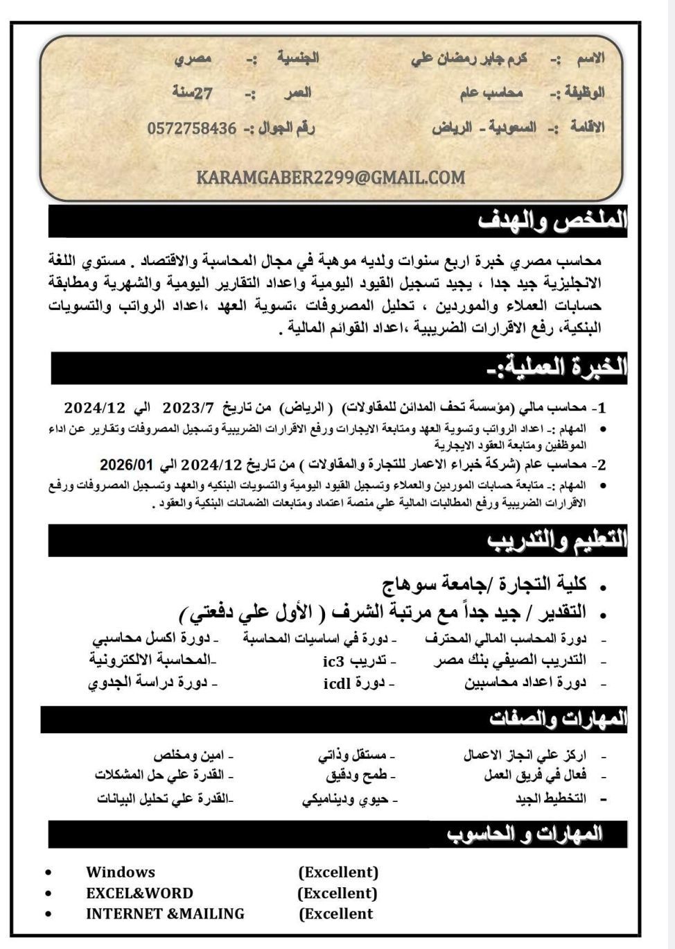 محاسب عام مصري خبرة أربع سنوات ولديه موهبة في مجال المحاسبة والاقتصاد. مستوى اللغة الانجليزية جيد جدا، يجيد تسجيل القيود اليومية واعداد التقارير اليومية والشهرية ومطابقة حسابات العملاء والموردين، تحليل المصروفات، تسوية العهد، اعداد الرواتب والتسويات البنكية، رفع الاقرارات الضريبية، اعداد القوائم المالية متواجد في الرياض إقامة سارية ومتاح نقل كفالة