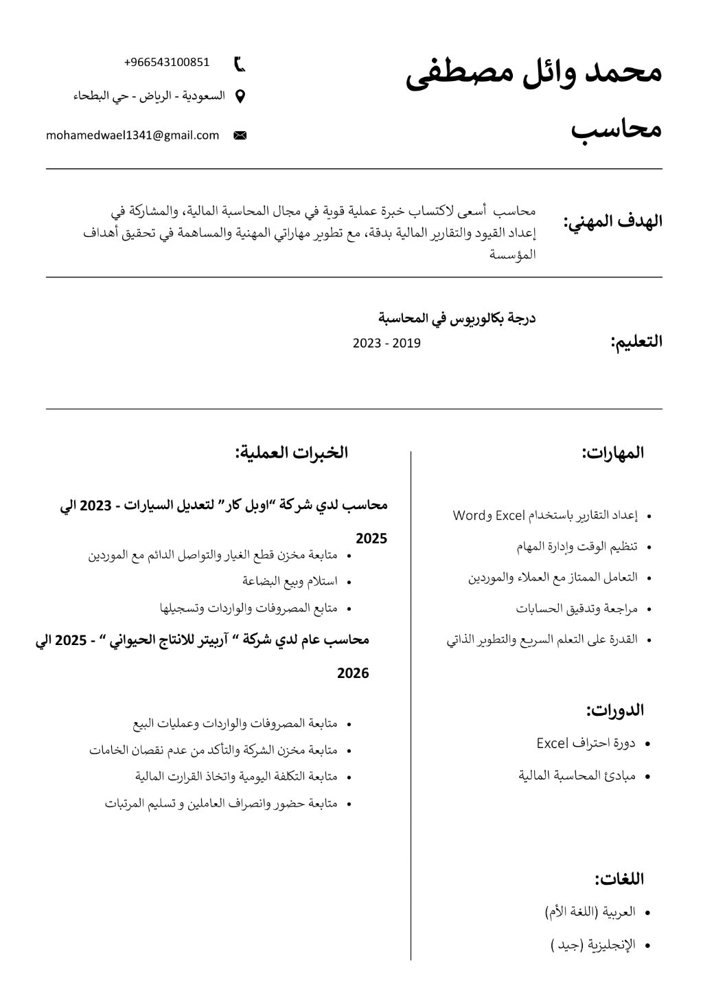 محاسب حديث التخرج حاصل على بكالوريوس تجارة شعبة محاسبة، العمر 24 سنة خبرة أكثر من سنتين في مصر ابحث عن فرصة عمل بالمملكة العربية السعودية مقيم في الرياض