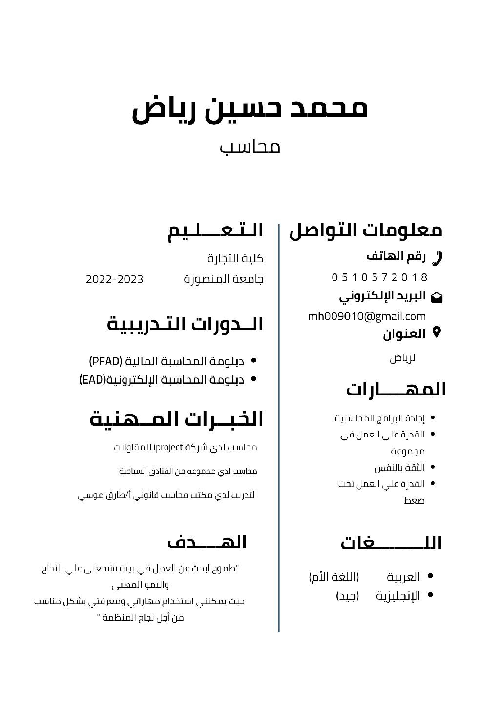 محاسب مصري حديث التخرج موجود في الرياض حاصل علي دبلومة المحاسبة المالية والمحاسبة الالكترونية خبرة جيدة بالأكسيل وبرامج الأوفيس وبعض برامج المحاسبة