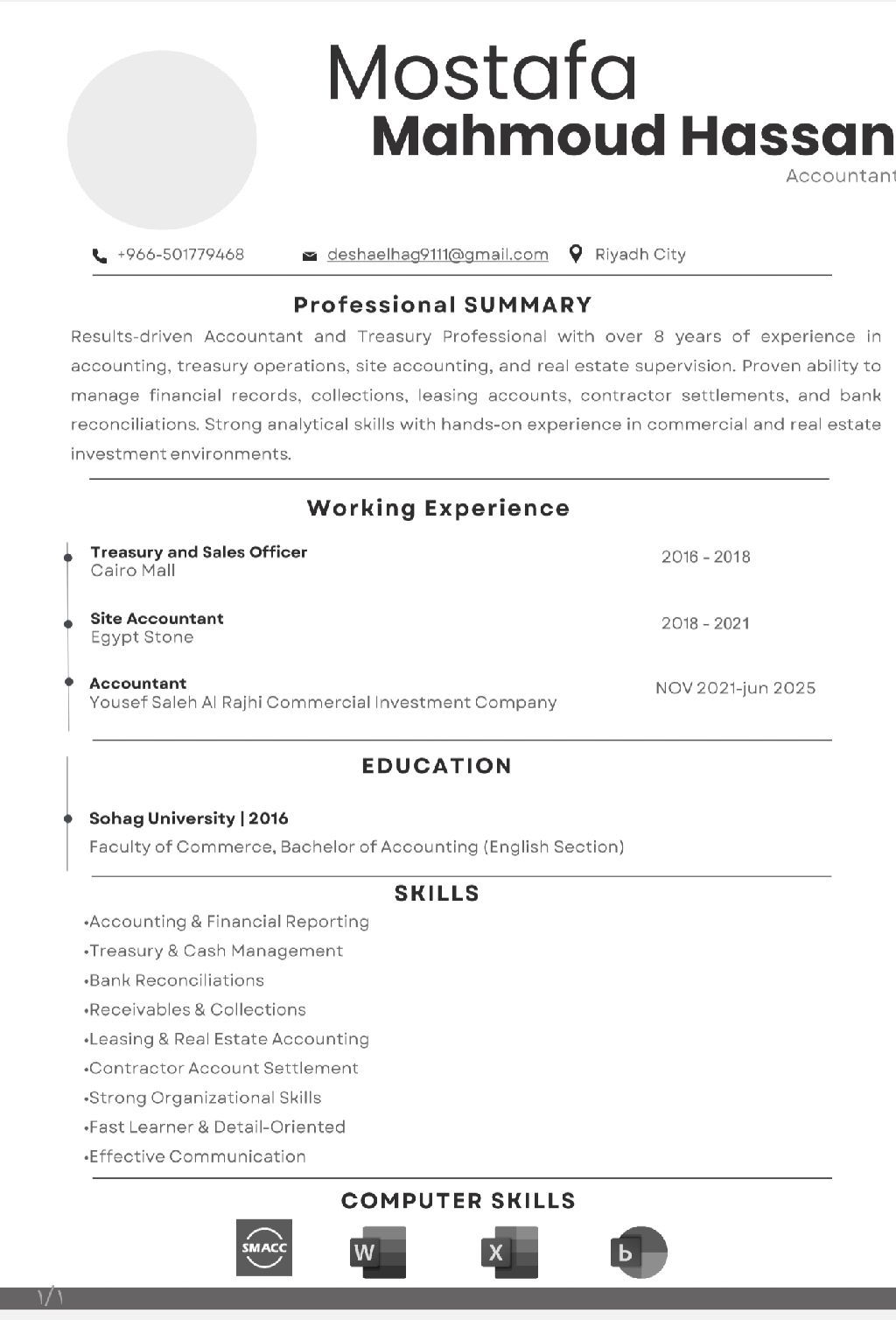 تحية طيبة مصطفى محمود السيد السن 34 سنة حاصل على بكالوريوس التجارة شعبة محاسبة انجليزية خبرة 4 سنوات في المملكة في الرياض في شركة عقار منهم سنتين مشرف للشركة ومسؤول عن ما يزيد عن 450 وحدة سكنية وتجارية تحصيل وتأجير وصيانة وعقود إيجار وتقييم متواجد بالمملكة ومتاح نقل كفالة اتمنى الانضمام لفريق العمل