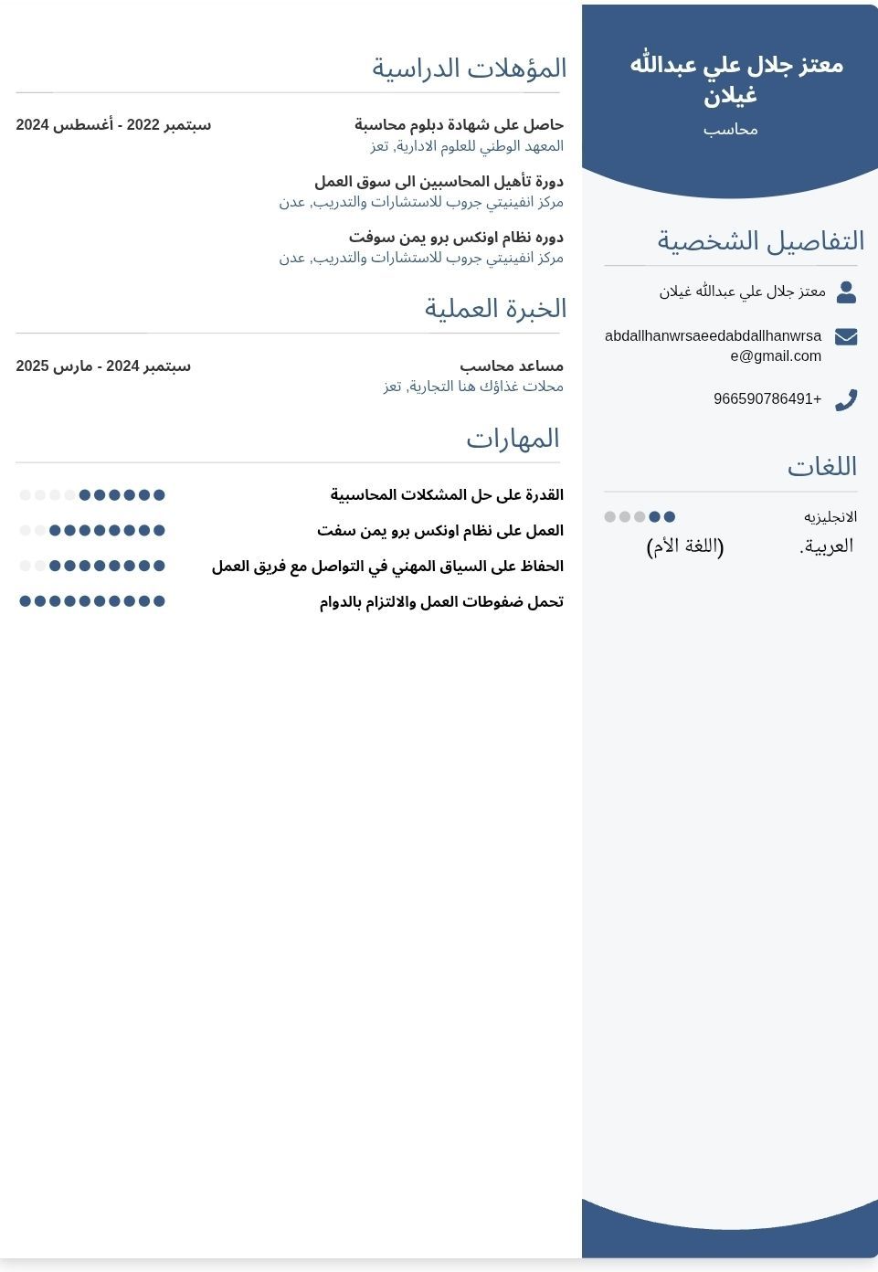 محاسب حديث التخرج حاصل على شهادة دبلوم وشهادة خبرة