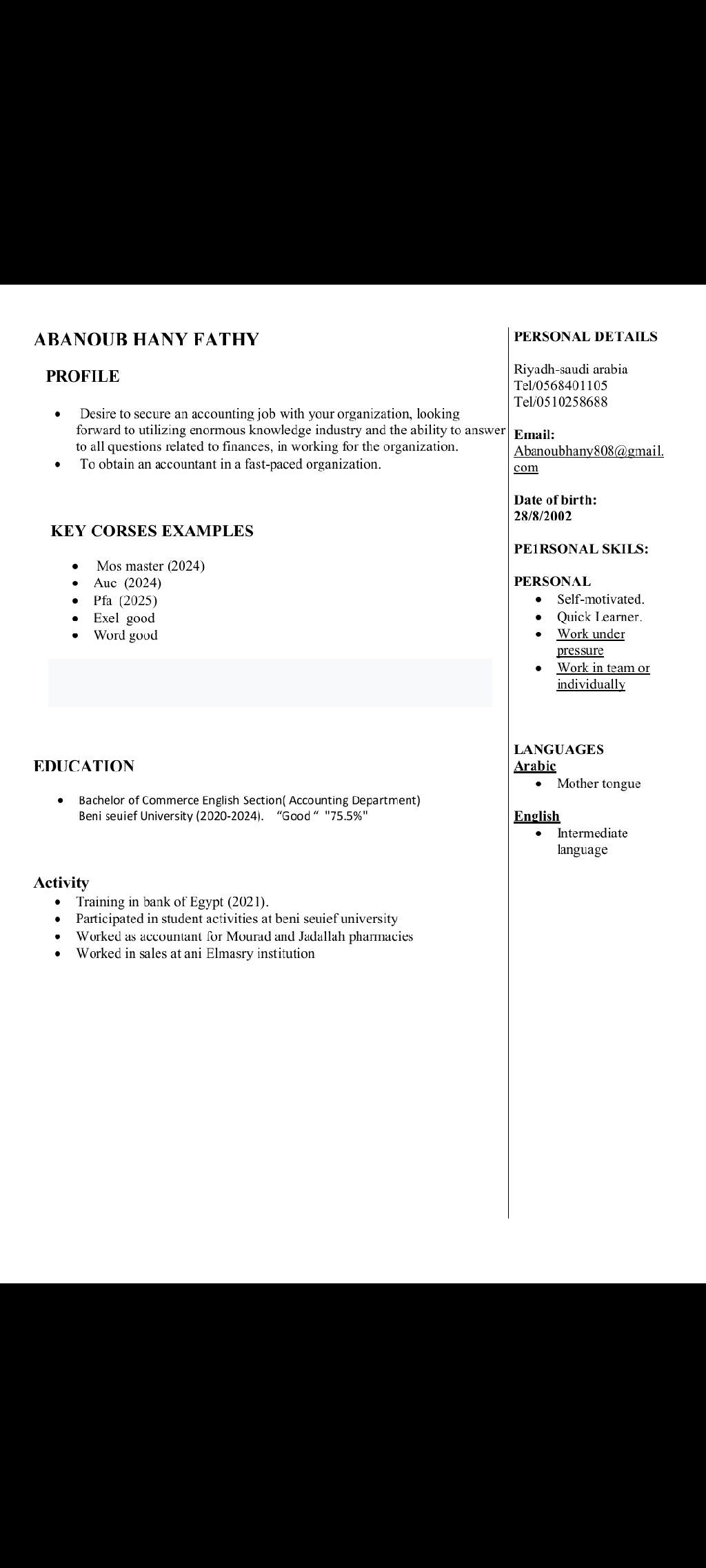 الاسم ابانوب هاني فتحي حاصل علي بكالوريوس تجارة قسم محاسبه شعبة لغة انجليزي جامعة بني سويف ابحث عن فرصة عمل كمحاسب ولدي اقامة سارية لمدة عام ولدي خبرة عامة في مجال المحاسبه واستخدام البرامج المحاسبية مثل الأكسيل وغيره حاصل علي تدريب لدي بنك مصر ولدي شهادات التخرج وموثقة من وزارة الخارجية المصرية ومجوعي في الدراسة 75.5%
