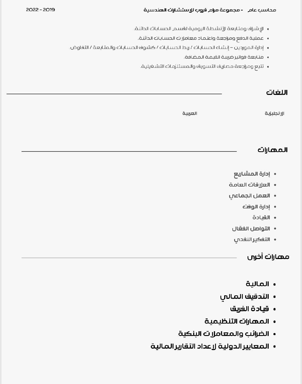 أنا محاسب بخبرة عملية في مجال المحاسبة العامة، عملت على إدارة الحسابات الدائنة والمدينة، المعاملات البنكية، التسويات، والتقارير المالية، بالاضافة الى التعامل مع ضريبة القيمة المضافة ومتطلبات التدقيق. لدي خبرة في الحسابات الدائنة والمدينة (محلية ودولية) التسويات البنكية وأقفال الصندوق والبنك التقارير المالية الشهرية وتحليل المصاريف مطابقة المخزون مع النظام المحاسبي التكاليف وتسعير المنتجات