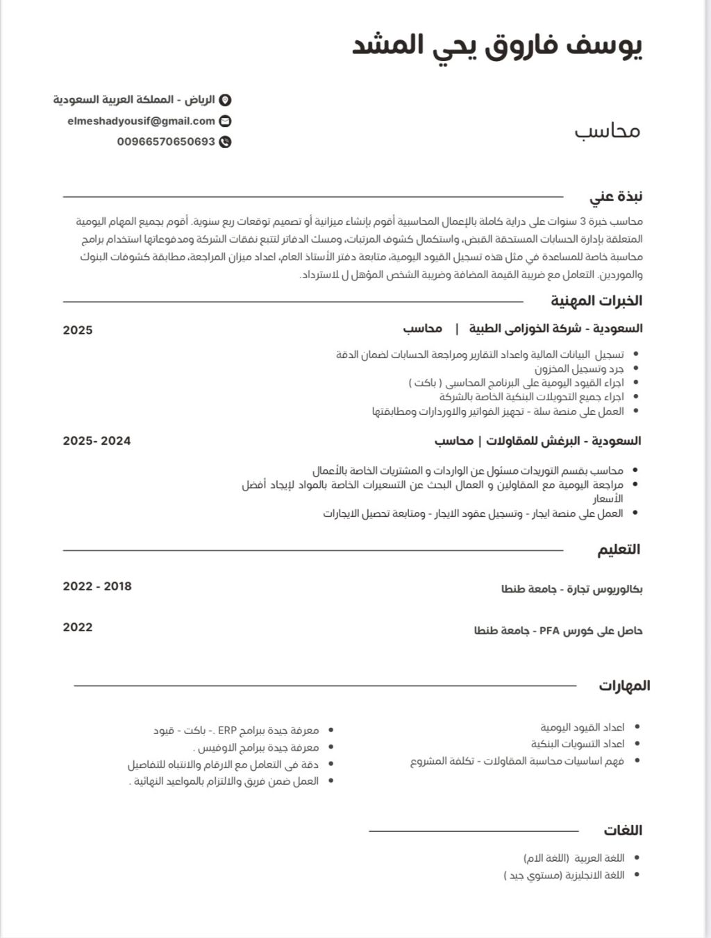 محاسب مالي خبرة سنتين بالمملكة أجيد العمل علي البرامج المحاسبية ERB باكت وقيود وعلي المنصات الحكومية وادارة البنوك ومطابقتها وتسجيل القيود اليومية ومراجعة دفتر الأستاذ وجرد المخزون ورفع الاقرار الضريبي وأجيد العمل علي برامج الأوفيس ومعي إقامة سارية قابلة ل النقل ورخصة قيادة
