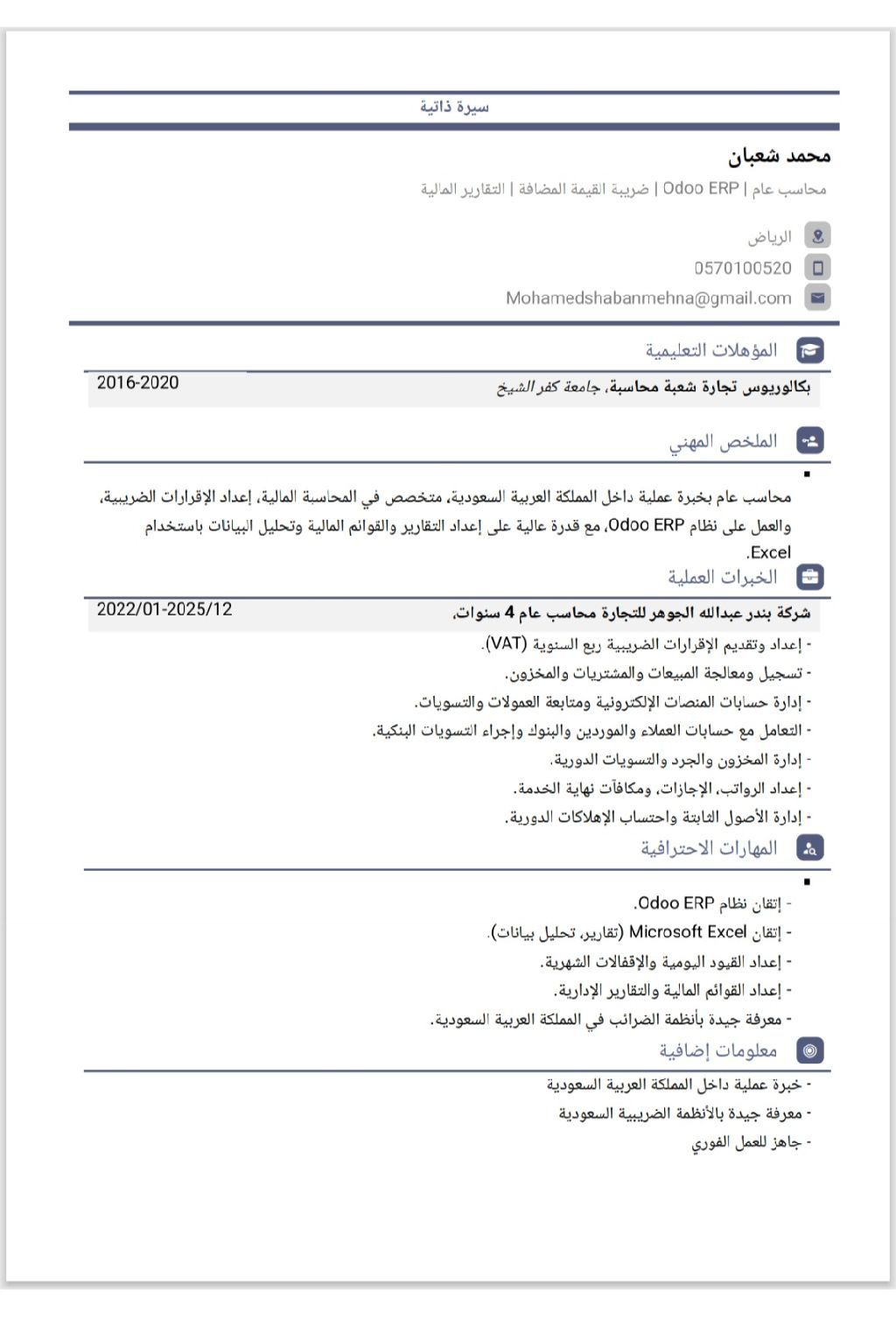 محاسب عام بخبرة تزيد عن 4 سنوات داخل السعودية، اعداد تقارير مالية، قيود يومية، تسويات بنكية وتسويات جردية، ضرائب، واجادة Excel والأنظمة المحاسبية. Odoo ERP