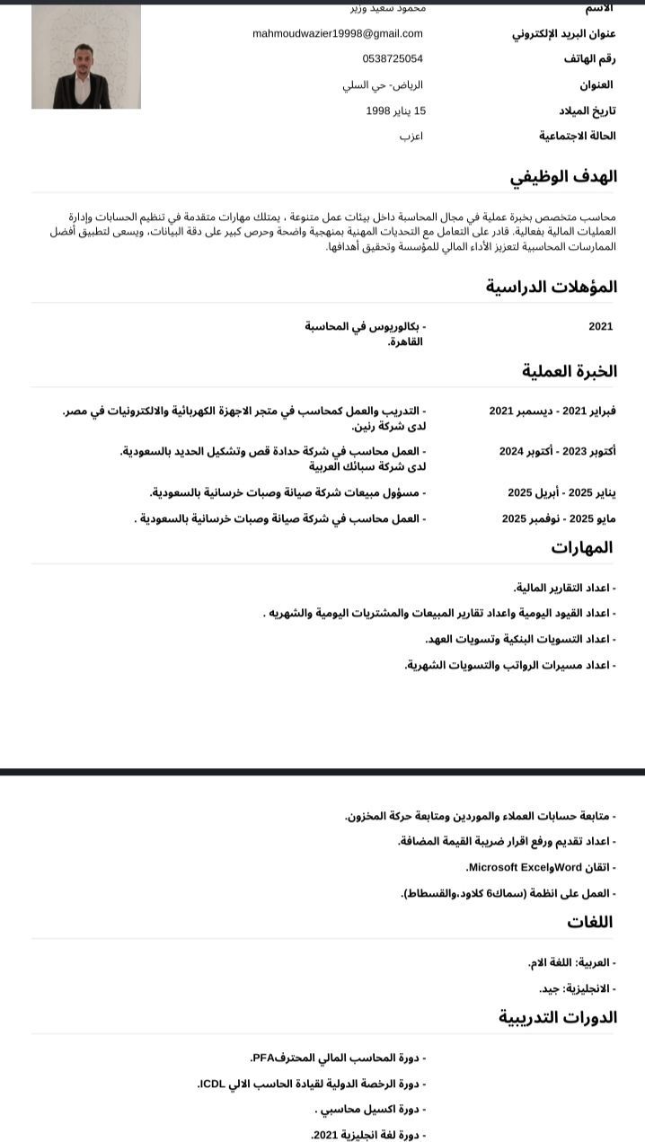 محاسب مصري خبرة أكثر من عامين بالمملكة من قيود يومية، وإقفالات شهرية، ومتابعة حركة المخزون، والتسويات البنكية، والتسويات الشهرية، واعداد مسيرات الرواتب، وتصفية حسابات العهد، مطابقة ومتابعة حسابات العملاء والموردين، العمل على برنامج سماك والقسطاط، واعداد ورفع الاقرار الضريبي على هيئة الزكاة والدخل