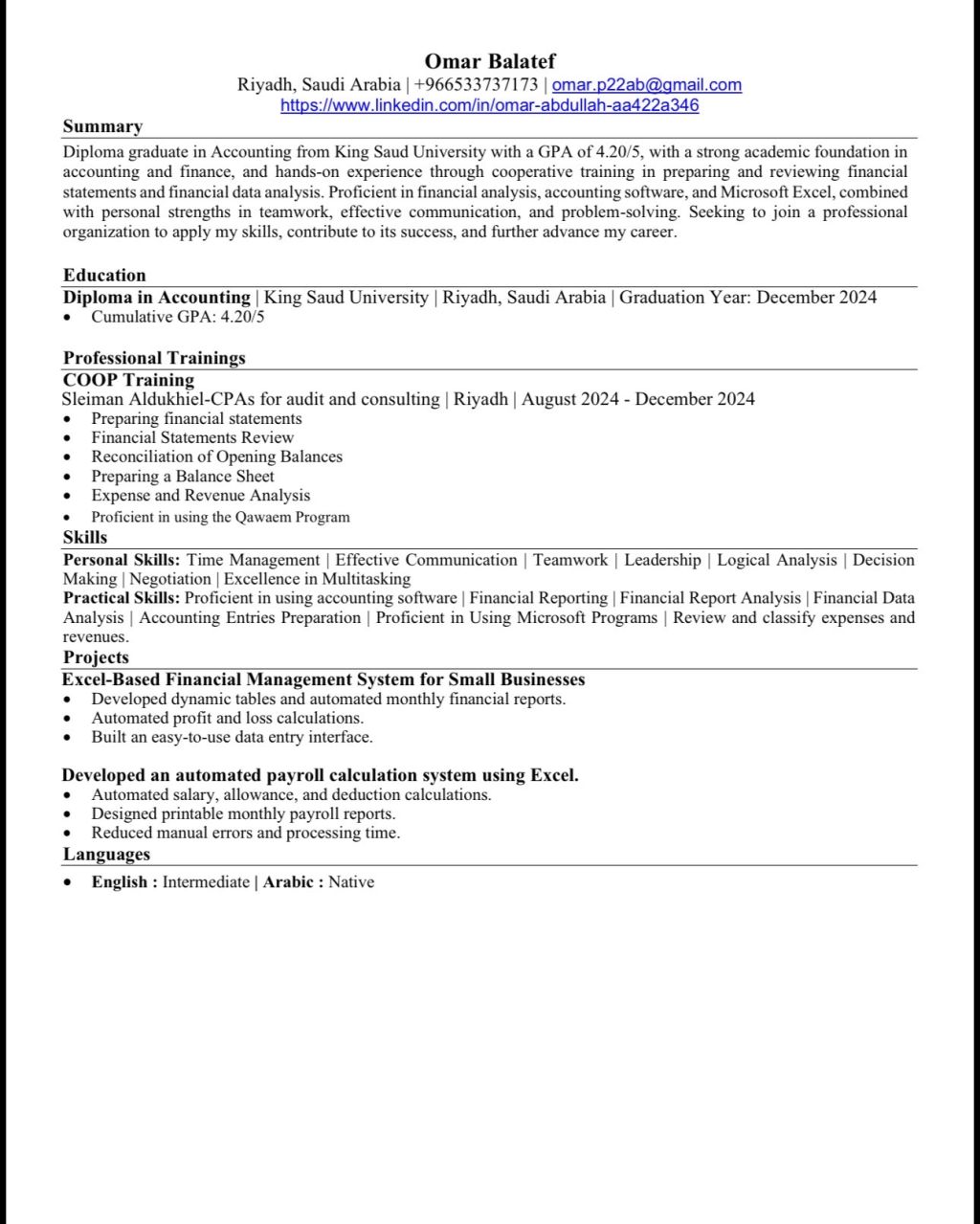 محاسب حديث تخرج خبرة 3 أشهر في مكاتب المحاسبة والمراجعة