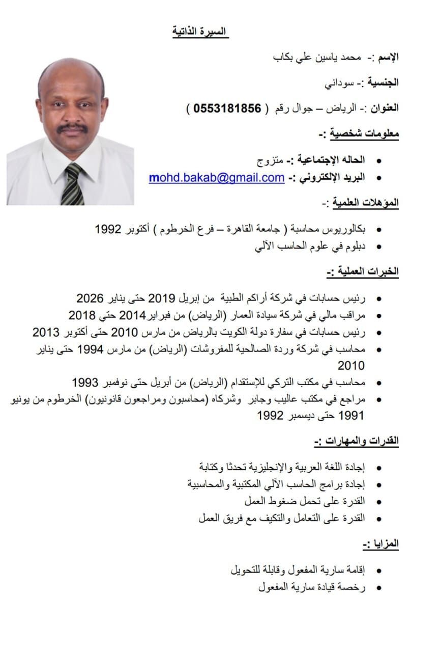 أنا محمد يس على سوداني الجنسية خبرة 35 سنة في مجال حسابات الشركات أرغب في وظيفة مدير حسابات