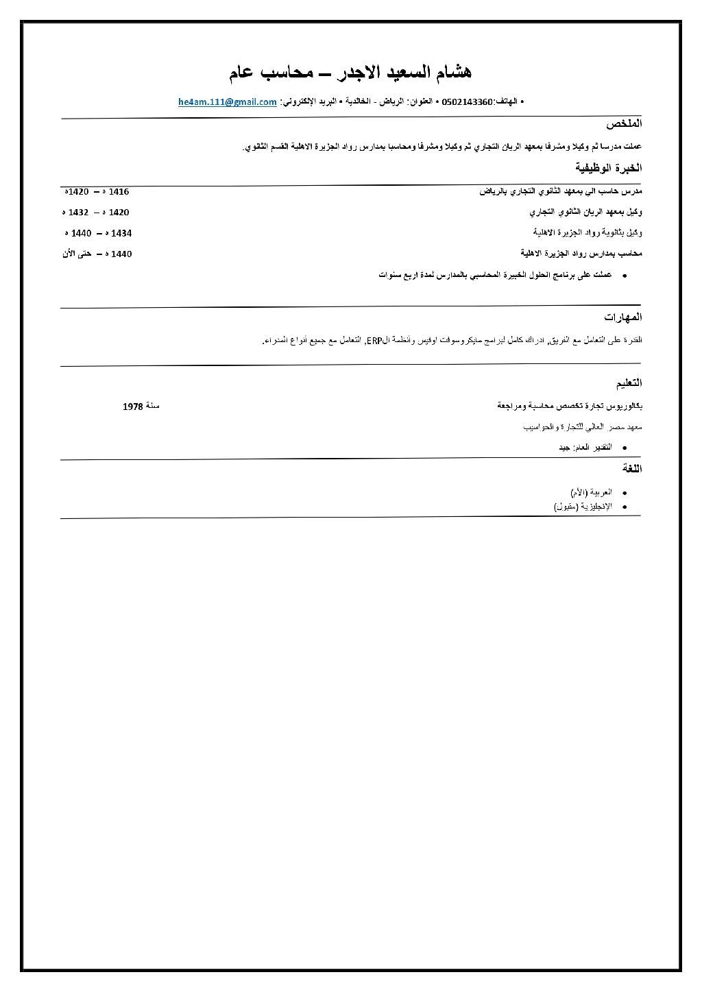 محاسب مدارس خبرة 7 سنوات على معرفة تامة ببرامج ماكيروسوفت أوفيس وعملت أيضا على برنامج الحلول الخبيرة لمدة 4 سنوات وأنظمة أل ERP