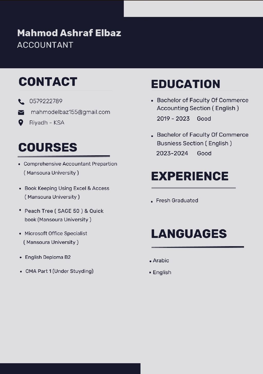 محاسب مصري حديث التخرج متواجد في الرياض جيد جدا في اللغة الانجليزية وأجيد التعامل مع الأكسيل جاهز للعمل ونقل الكفالة فورا للتواصل واتساب 0579222789