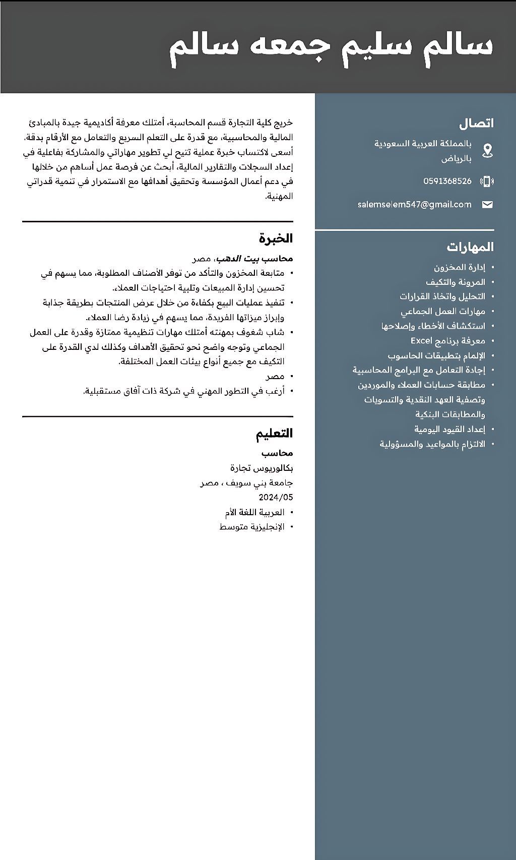 محاسب مصري حديث التخرج ابحث عن عمل، حاصل على بكالوريوس تجارة قسم محاسبة، أجيد التعامل مع برامج الأوفيس (الأكسيل - الوورد) وأجيد التعامل مع البرامج المحاسبية وأنظمة ERP، التوجيه المحاسبي الصحيح للمعاملات المالية المختلفة، مطابقة حسابات العملاء والموردين والتسويات البنكية. إقامة سارية